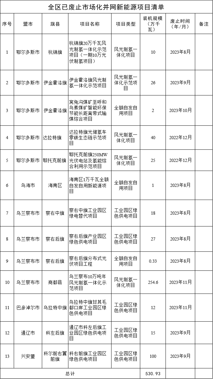12月4日,內(nèi)蒙古自治區(qū)能源局對各盟市已廢止的市場化并網(wǎng)新能源項目進(jìn)行了公告,合計13個項目,涉及裝機(jī)規(guī)模超530萬千瓦,項目清單如下: