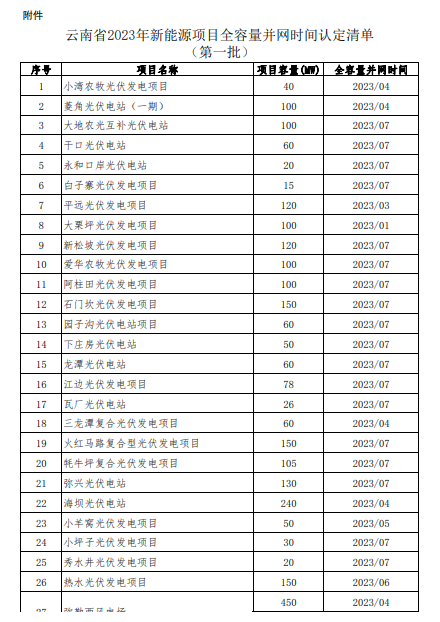 云南省能源局會(huì)同有關(guān)部門和發(fā)電企業(yè)共同確定了《云南省新能源項(xiàng)目全容量并網(wǎng)時(shí)間技術(shù)認(rèn)定指南(試行)》,并由云南電網(wǎng)公司組織開展全容量并網(wǎng)時(shí)間技術(shù)認(rèn)定工作。我局收到云南電網(wǎng)公司提交的24家發(fā)電企業(yè)共89個(gè)項(xiàng)目技術(shù)認(rèn)定報(bào)告,經(jīng)認(rèn)真復(fù)核,同時(shí)征求了云南省發(fā)展和改革委員會(huì)、國家能源局云南監(jiān)管辦的意見,形成了《2023年新能源項(xiàng)目全容量并網(wǎng)時(shí)間認(rèn)定清單(第一批)》?,F(xiàn)對(duì)2023年第一批89個(gè)項(xiàng)目的名稱、容量、全容量并網(wǎng)時(shí)間等信息進(jìn)行公示。