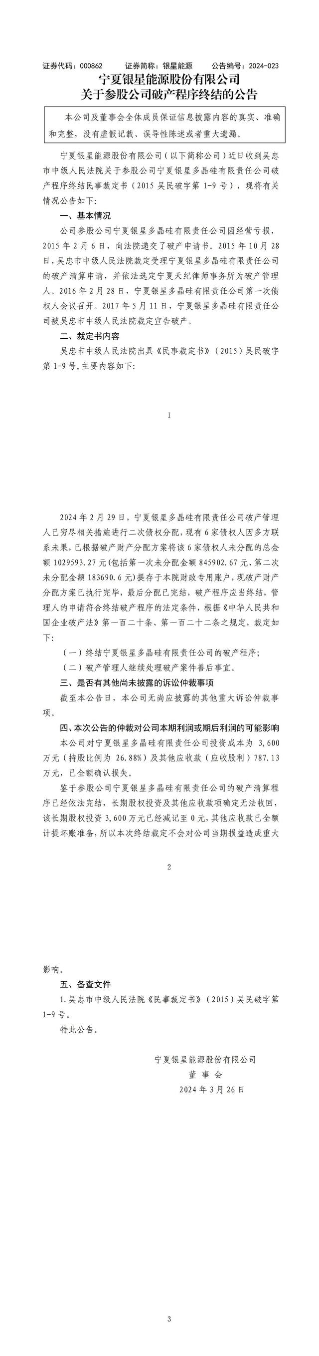 公司參股公司寧夏銀星多晶硅有限責(zé)任公司因經(jīng)營虧損,2015年2月6日,向法院遞交了破產(chǎn)申請書。2015年10月28日,吳忠市中級人民法院裁定受理寧夏銀星多晶硅有限責(zé)任公司的破產(chǎn)清算申請,并依法選定寧夏天紀(jì)律師事務(wù)所為破產(chǎn)管理人。2016年2月28日,寧夏銀星多晶硅有限責(zé)任公司第一次債權(quán)人會議召開。2017年5月11日,寧夏銀星多晶硅有限責(zé)任公司被吳忠市中級人民法院裁定宣告破產(chǎn)。2024年2月29日,吳忠市中級人民法院裁定如下:終結(jié)寧夏銀星多晶硅有限責(zé)任公司的破產(chǎn)程序,破產(chǎn)管理人繼續(xù)處理破產(chǎn)案件善后事宜。