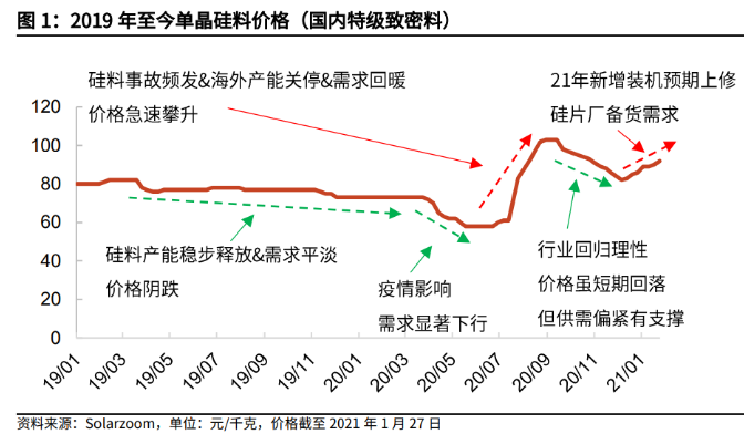 在硅料景氣度高漲的背景下,部分投資者擔(dān)心技術(shù)的更新迭代(顆粒硅技術(shù))將給硅料生產(chǎn)龍頭公司未來的發(fā)展前景帶來不確定性,但是我們認(rèn)為,當(dāng)前硅料環(huán)節(jié)的主要矛盾是2021年供需形式緊張(供不應(yīng)求)帶來的硅料供應(yīng)階段性緊缺,這也將推動(dòng)硅料價(jià)格維持高位,甚至在特定時(shí)間或特殊因素催化下突破100元/千克的高位,從而保障硅料龍頭企業(yè)(通威股份、新特能源、東方希望、大全新能源等)2021年的業(yè)績?cè)鲩L和盈利能力維持;技術(shù)更新迭代則是當(dāng)前時(shí)點(diǎn)的次要矛盾,F(xiàn)BR顆粒硅技術(shù)的確有望成為下一代光伏的硅料技術(shù),但是目前顆粒硅的產(chǎn)能、下游使用占比仍相對(duì)較低,需持續(xù)關(guān)注保利協(xié)鑫2021年6月底顆粒硅產(chǎn)能擴(kuò)產(chǎn)至3萬噸后顆粒硅品質(zhì)的提升、下游硅片廠商應(yīng)用、以及成本的降低情況。(文章來源:光大證券)