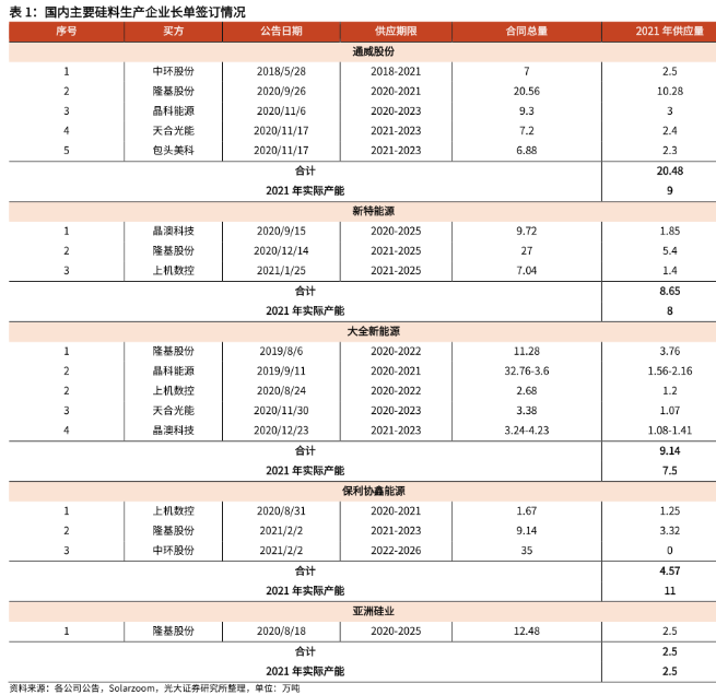 在經(jīng)歷了19年的硅料產(chǎn)能釋放周期后,2020年我國硅料產(chǎn)能增量有限,且海外OCI先后關(guān)停韓國兩家多晶硅工廠(總產(chǎn)能從7.9萬噸滑落至3.2萬噸),2020年國內(nèi)硅料在產(chǎn)產(chǎn)能從2019年的45.6萬噸小幅提升至48.4萬噸,全球硅料在產(chǎn)產(chǎn)能則從2019年底的62.2萬噸減少1.9萬噸至60.3萬噸。2021年,國內(nèi)的新產(chǎn)能投放大多集中在Q4,因此對(duì)全年的實(shí)際產(chǎn)能貢獻(xiàn)有限,預(yù)計(jì)2021年全球的硅料供應(yīng)量約為55萬噸,可滿足約170GW的硅片生產(chǎn)需求。與此同時(shí),下游的硅片廠商則在高利潤留存的背景下在2019年開啟了大規(guī)模擴(kuò)產(chǎn)浪潮。2019年在上游環(huán)節(jié)價(jià)格下跌的情況下硅片價(jià)格依然堅(jiān)挺,單晶硅片環(huán)節(jié)相較其他供應(yīng)鏈環(huán)節(jié)仍存在較高的利潤空間,因此各硅片企業(yè)均開啟了較為激進(jìn)的擴(kuò)張計(jì)劃,全國單晶硅片總名義產(chǎn)能從2019年的120GW擴(kuò)張至2020年的217GW。展望2021年,各大硅片龍頭及二、三線硅片企業(yè)仍維持了較大規(guī)模的產(chǎn)能擴(kuò)張節(jié)奏,2021年底的單晶硅片名義產(chǎn)能有望再創(chuàng)新高突破300GW。在2021年硅料實(shí)際貢獻(xiàn)有限、而硅片產(chǎn)能大幅擴(kuò)張的背景下,硅片廠商于2020Q3開始密集通過和上游硅料企業(yè)簽訂鎖量不鎖價(jià)的硅料供貨長協(xié)鎖定硅料供應(yīng),從而滿足自身的生產(chǎn)需求。根據(jù)我們的統(tǒng)計(jì),2021年已有超過80%的硅料產(chǎn)能被長協(xié)合同鎖定,主流硅料生產(chǎn)廠商中僅有保利協(xié)鑫的部分硅料產(chǎn)能尚未簽訂長協(xié)合同。