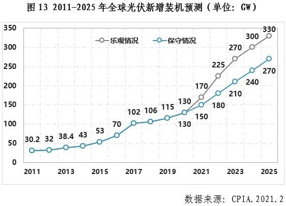 (二)我國光伏市場將進入快速發(fā)展新階段2021年是“十四五”規(guī)劃的開局之年,也是我國光伏發(fā)電進入平價上網(wǎng)的關鍵之年。2021年我國光伏應用市場將繼續(xù)保持快速增長勢頭,預計新增裝機規(guī)??蛇_55-65GW,其中競價結轉項目10GW左右,戶用市場有望達到15GW,工商業(yè)分布式預計在10GW左右,外送及平價地面電站在20-30GW左右。在“碳達峰、碳中和”目標下, “十四五”期間我國光伏市場將迎來市場化建設高峰,預計國內(nèi)年均光伏裝機新增規(guī)模在70-90GW,有望進一步加速我國能源轉型。