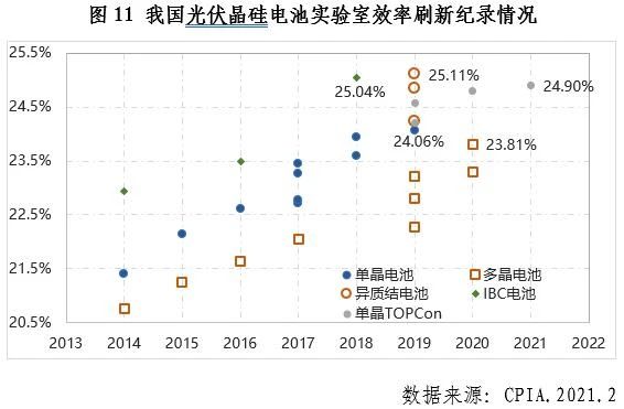 實驗室方面,2020年4月,晶科研發(fā)的多晶硅(Multicrystalline)電池片實驗室效率達到23.3%,并被收錄于NREL電池片轉換效率紀錄表中,隨后阿特斯宣布將該效率提高至23.81%。7月,晶科宣布其研發(fā)的N型單晶硅單結電池片效率達到24.79%,2021年1月,將該紀錄再次刷新到24.90%,創(chuàng)造了新的大面積N型單晶鈍化接觸電池片效率世界紀錄。我國除了在晶硅電池技術方面領先全球外,鈣鈦礦、有機電池等電池片實驗室效率也走在世界前列,2020年7月,杭州纖納光電以18.04%的鈣鈦礦小組件光電轉換效率的成績,第七次蟬聯(lián)了鈣鈦礦小組件世界紀錄榜首。目前NREL電池片轉換效率紀錄表中,除晶科的多晶硅電池片外,上海交大/北航、中科院化學所和漢能分別研發(fā)的有機電池、有機疊層電池和薄膜電池仍保持著世界紀錄。