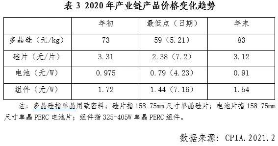 (四)產(chǎn)業(yè)鏈供給矛盾突出2020年,光伏產(chǎn)品價格經(jīng)歷了V字型起伏的過程,光伏產(chǎn)業(yè)硅料、玻璃和EVA膠膜等部分原輔材料環(huán)節(jié)出現(xiàn)的供需緊張也前所未有。上半年,受全球疫情蔓延影響,對下游應用市場未來需求的不確定性導致產(chǎn)業(yè)鏈大幅降價,各環(huán)節(jié)價格降幅均在20%左右。硅料環(huán)節(jié),三季度受到事故及自然災害等因素影響供應緊張,8月多晶硅致密料價格由6月的59元/公斤增加至約95元/公斤,漲幅約為60%;四季度隨著新疆地區(qū)硅料企業(yè)復工,多晶硅價格回落,但仍高于二季度價格低點38%。EVA膠膜的生產(chǎn)設備及原材料EVA粒子可用于防疫物資生產(chǎn),2020年防疫物資需求暴漲,使得生產(chǎn)設備及EVA粒子供應緊張,膠膜企業(yè)擴產(chǎn)受阻延遲,在下半年需求暴漲的情況下,EVA膠膜企業(yè)只能通過大幅漲價的方式來獲取EVA粒子資源。下半年EVA膠膜價格上漲了50%,一度達到14元/平方米的高價,和POE膠膜的價格形成了倒掛。下半年需求的集中爆發(fā)導致光伏玻璃供給出現(xiàn)巨大缺口,價格快速上漲,年底3.2mm光伏玻璃價格達到了43元/平方米,較5-6月最低時上漲80%,部分企業(yè)采用浮法玻璃作為雙面組件的背板玻璃。進入12月,產(chǎn)品價格趨于平緩。但全年來看,除多晶硅價格上漲13.7%以外,硅片、電池、組件產(chǎn)品價格仍分別下降了5.7%、6.7%與10.5%,降本增效發(fā)展方向沒有變,長期來看價格依然是下降趨勢。