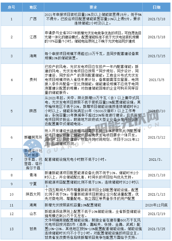 就消納掣肘,光伏電站配置儲(chǔ)能成為政策導(dǎo)向。據(jù)北極星太陽(yáng)能光伏網(wǎng)統(tǒng)計(jì),2021開年以來,廣西、江西、貴州、山東、海南等13個(gè)地區(qū)要求風(fēng)、光項(xiàng)目強(qiáng)配儲(chǔ)能,比例在5%~10%之間,連續(xù)儲(chǔ)能在2小時(shí)及以上。然而在儲(chǔ)能經(jīng)濟(jì)性仍未達(dá)到預(yù)期且獲利商業(yè)模式仍未明朗下,強(qiáng)配儲(chǔ)能對(duì)于光伏電站投資業(yè)主來說無疑是雪上加霜。