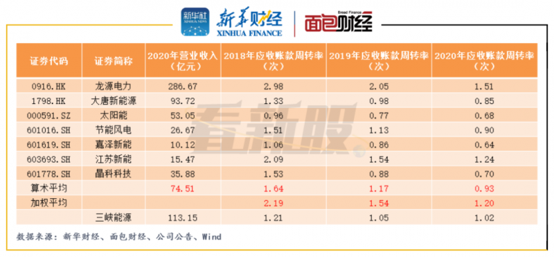 可以看出,2020年三峽能源的應(yīng)收賬款周轉(zhuǎn)率為1.02次,略高于可比公司平均水平,但是低于可比公司以當(dāng)期營業(yè)收入加權(quán)后的平均值,與龍?jiān)措娏Α⒔K新能應(yīng)收賬款周轉(zhuǎn)水平仍有較大差距,日后賒銷回款效率有待觀察。