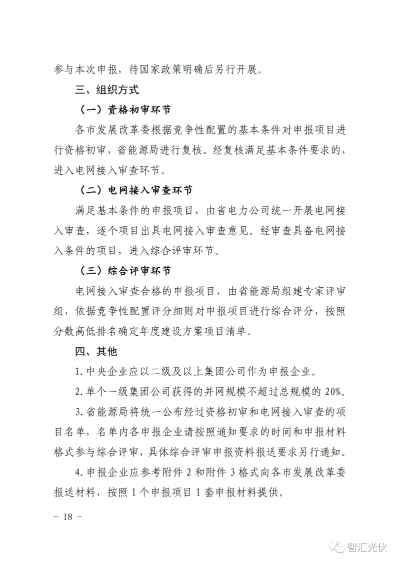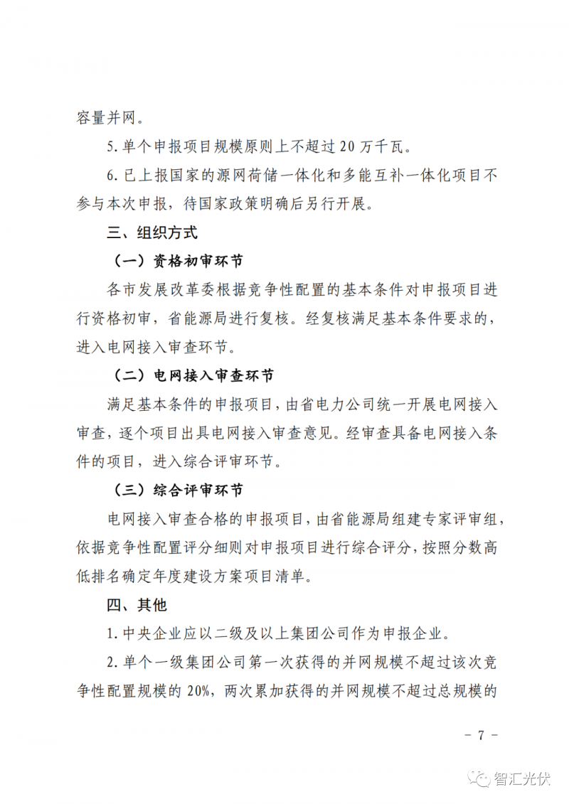 4)光伏項目:單個申報項目規(guī)模原則上不超過 20 萬千瓦。單個一級集團(tuán)公司第一次獲得的并網(wǎng)規(guī)模不超過該次競爭性配置規(guī)模的 20%,兩次累加獲得的并網(wǎng)規(guī)模不超過總規(guī)模的20%。
