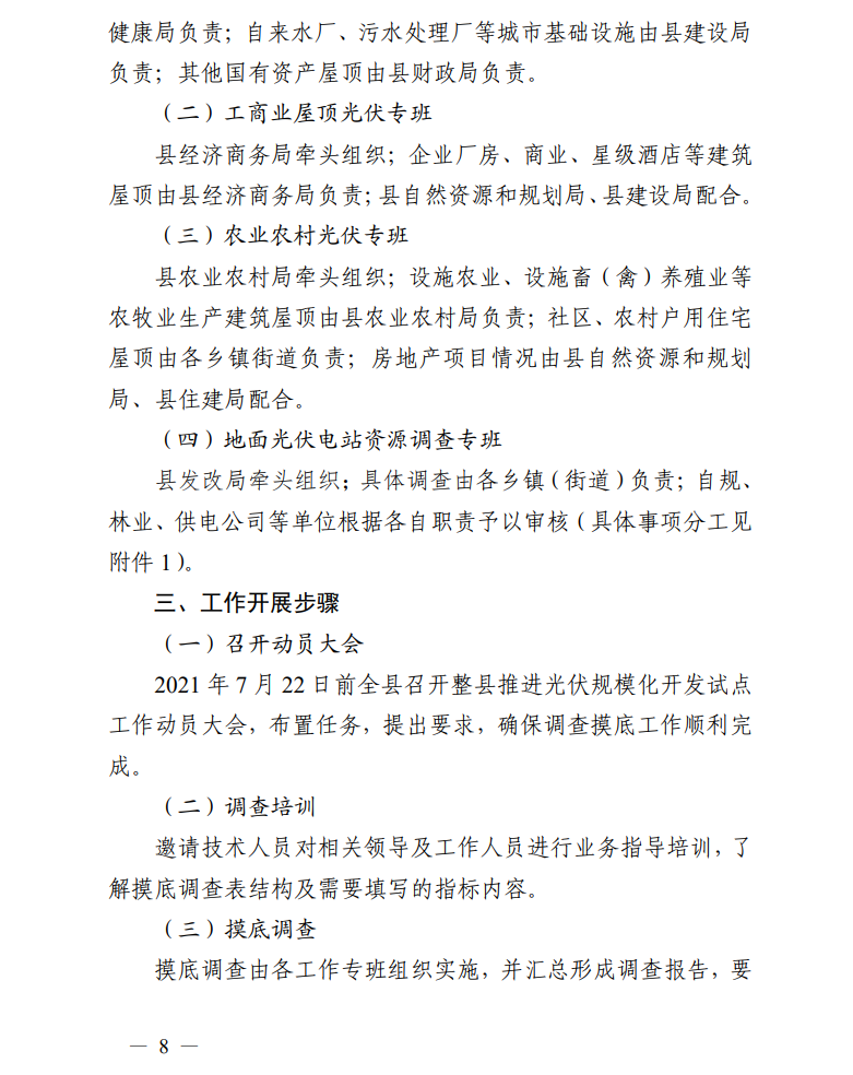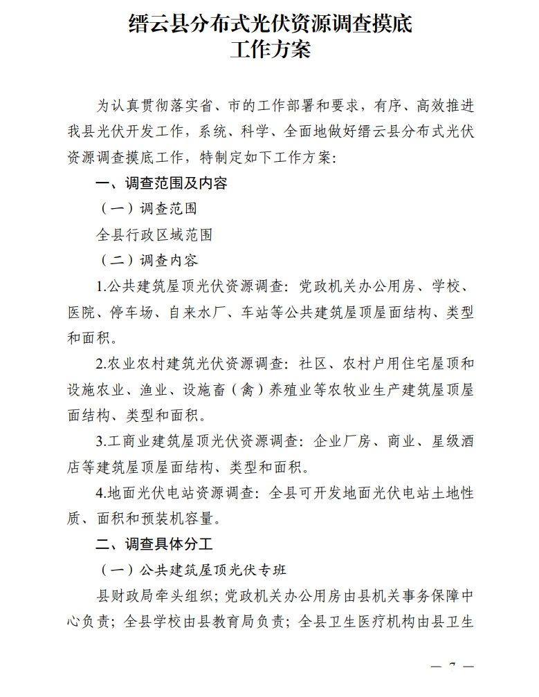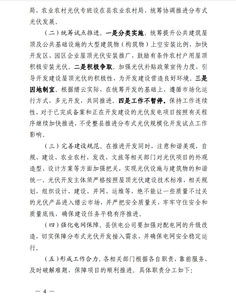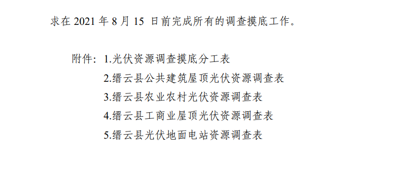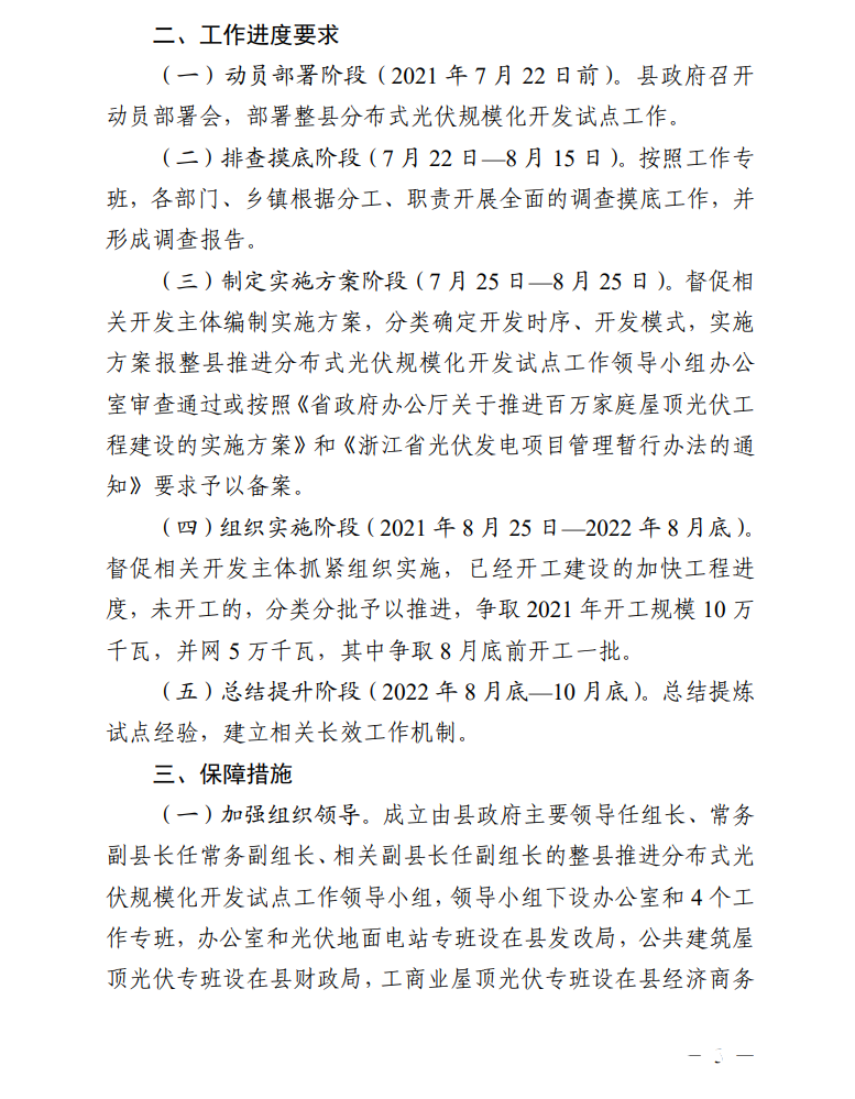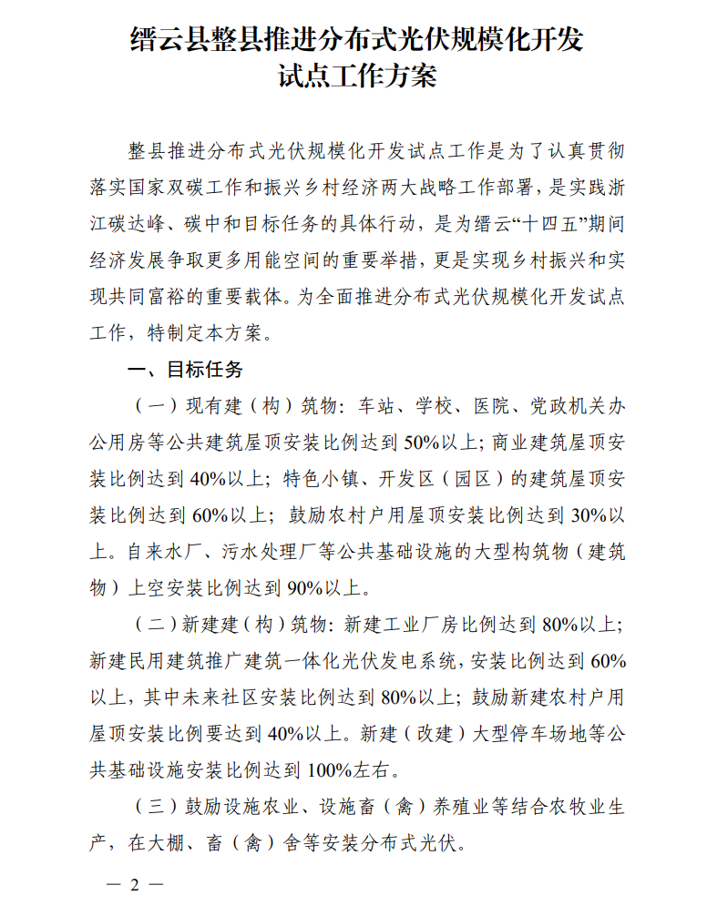 日前,縉云縣人民政府辦公室發(fā)布關(guān)于印發(fā)《縉云縣整縣推進分布式光伏規(guī)?;_發(fā)試點工作方案》《縉云縣分布式光伏資源調(diào)查摸底工作方案》的通知。通知明確,縉云縣整縣推進分布式光伏規(guī)模化開發(fā)試點工作目標任務(wù)為: