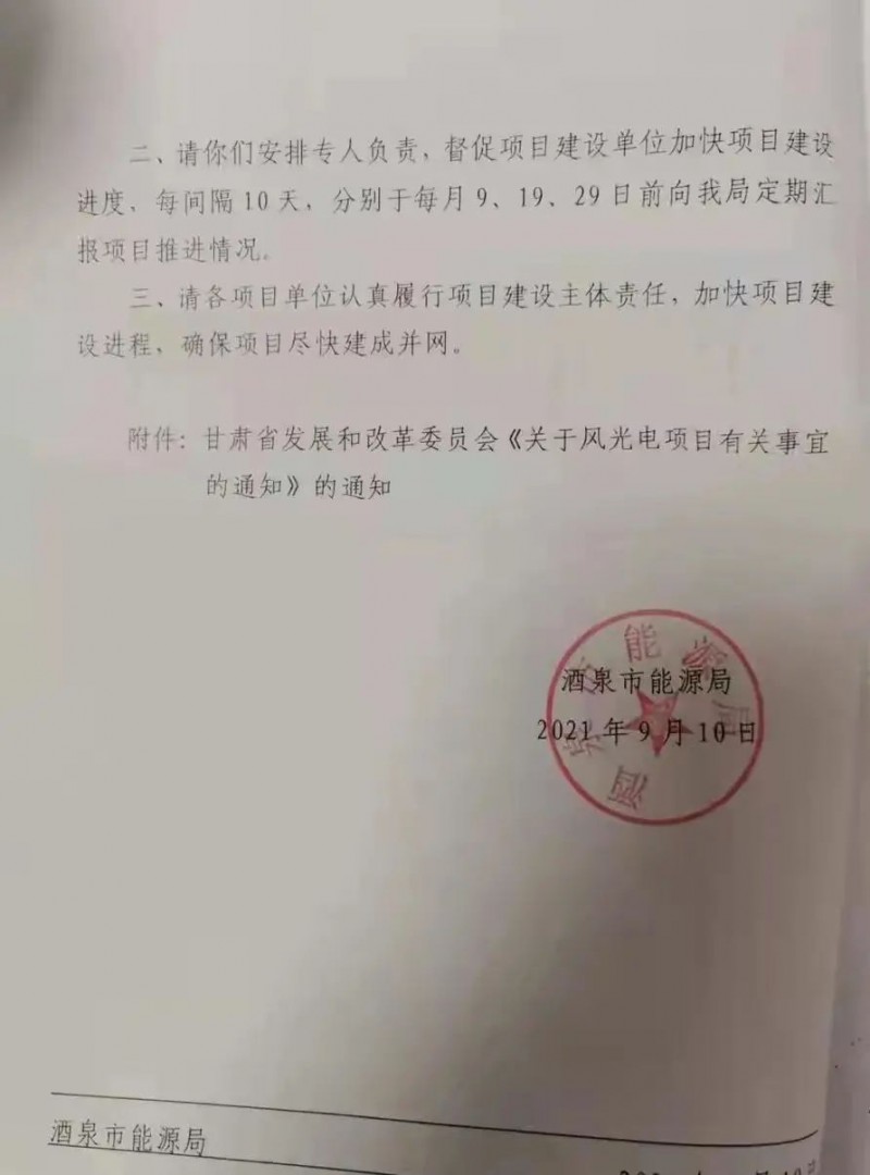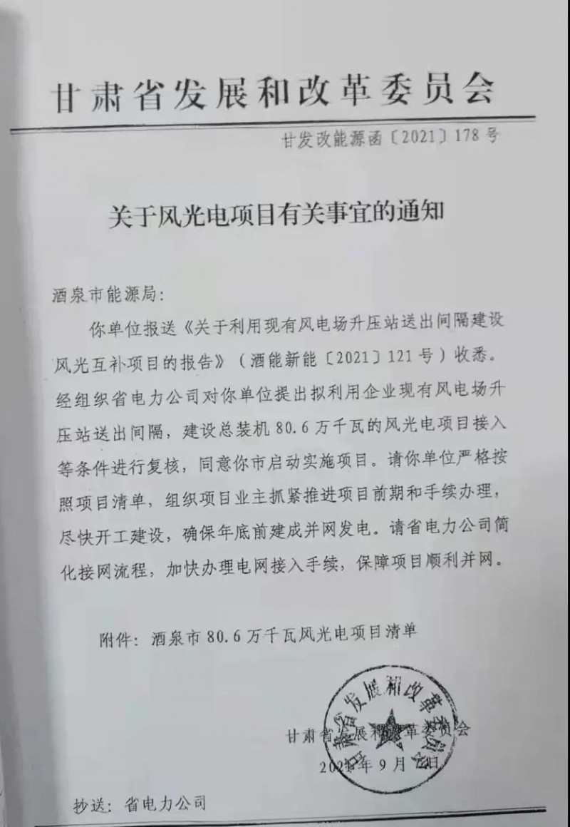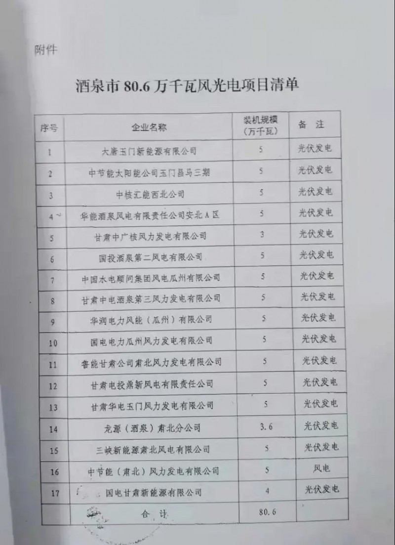 酒泉市2021年風、光建設(shè)規(guī)模為806MW,其中光伏756MW,風電50MW;