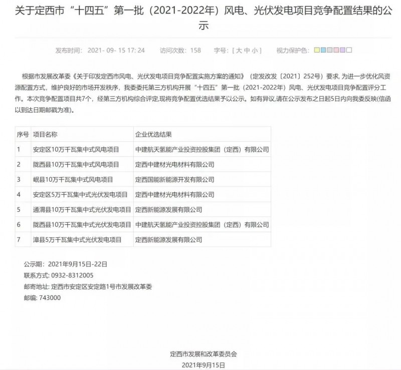 近日,甘肅定西市公布十四五”第一批(2021-2022年)風電、光伏發(fā)電項目競爭配置結(jié)果,根據(jù)文件,競爭配置風電、光伏發(fā)電項目7個,建設(shè)總規(guī)模600MW。其中,風電項目3個、建設(shè)規(guī)模300MW,光伏發(fā)電項目4個、建設(shè)規(guī)模為300MW。競爭配置風電、光伏發(fā)電項目配置儲能容量不低于風電、光伏發(fā)電項目配置容量的5%,配置風電、光伏發(fā)電項目與儲能設(shè)施必須于2022年11月底前全容量建成投產(chǎn)。其中,風電項目必須于2021年12月底前開工建設(shè),光伏發(fā)電項目必須于2021年12月底前實現(xiàn)一半以上并網(wǎng)規(guī)模。