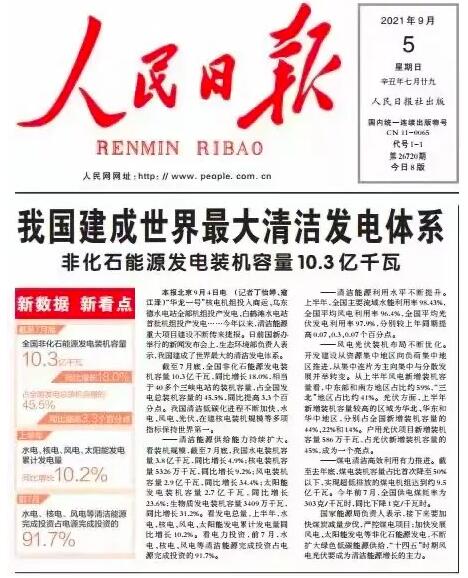 我國清潔低碳化進(jìn)程不斷加快,水電、風(fēng)電、光伏、在建核電裝機規(guī)模等多項指標(biāo)保持世界第一。