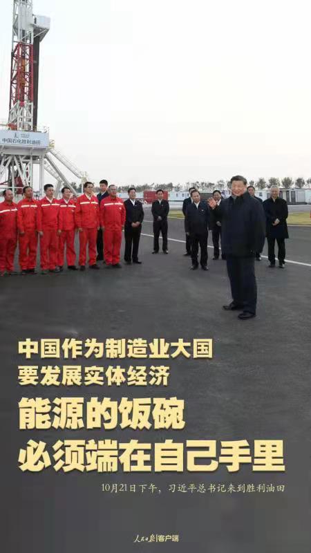 10月21日下午,習(xí)近平總書記來(lái)到勝利油田,登上鉆井平臺(tái),察看作業(yè)情況,看望慰問(wèn)石油工人。今年是勝利油田發(fā)現(xiàn)60周年。習(xí)近平代表黨中央向廣大石油職工致以誠(chéng)摯問(wèn)候。習(xí)近平指出,石油能源建設(shè)對(duì)我們國(guó)家意義重大,中國(guó)作為制造業(yè)大國(guó),要發(fā)展實(shí)體經(jīng)濟(jì),能源的飯碗必須端在自己手里。希望你們?cè)賱?chuàng)佳績(jī)、再立新功。
