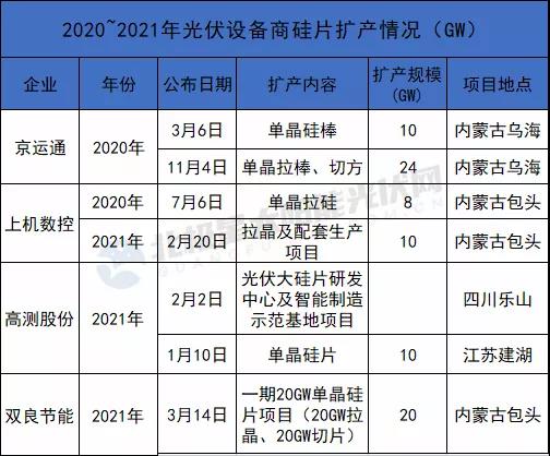 而2021年截至目前,隆基暫未公開硅片相關(guān)擴產(chǎn)計劃,2020年其在云南新擴70GW單晶產(chǎn)能。