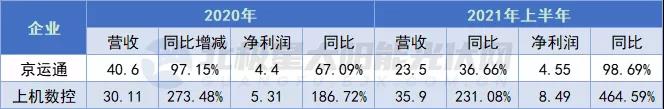 以鑄錠爐起家的京運通從2017年開始主攻硅片業(yè)務,截至2021年中,京運通單晶硅片產(chǎn)能約8GW,另有12GW新增產(chǎn)能處于爬產(chǎn)期,預計2021年底產(chǎn)能達20GW;切割設(shè)備商上機數(shù)控從2019 年通過全資子公司弘元新材進一步拓展單晶硅業(yè)務,截至2021年中,實際產(chǎn)能20GW。2020年以及2021年上半年,京運通、上機數(shù)控營收及凈利潤均實現(xiàn)了大幅增長,最高漲幅達464.59%,主要原因均指向硅片營收的大增。其中,上機數(shù)控2021年上半年營收及凈利潤均超過2020年全年。