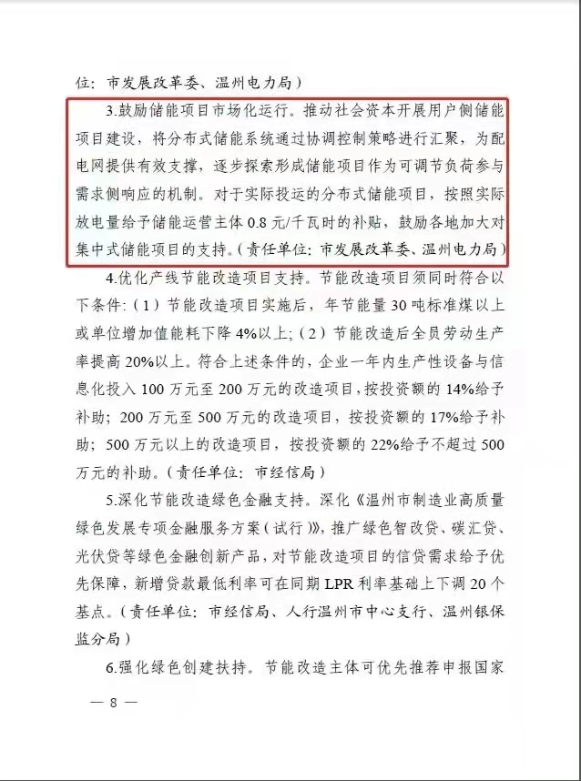 同時(shí),推動(dòng)社會(huì)資本開(kāi)展用戶(hù)側(cè)儲(chǔ)能項(xiàng)目建設(shè),將分布式儲(chǔ)能系統(tǒng)通過(guò)協(xié)調(diào)控制策略進(jìn)行匯聚,為配電網(wǎng)提供有效支撐,逐步探索形成儲(chǔ)能項(xiàng)目作為可調(diào)節(jié)負(fù)荷參與需求側(cè)響應(yīng)的機(jī)制。對(duì)于實(shí)際投運(yùn)的分布式儲(chǔ)能項(xiàng)目,按照實(shí)際放電量給予儲(chǔ)能運(yùn)營(yíng)主體0.8元/千瓦時(shí)的補(bǔ)貼,鼓勵(lì)各地加大對(duì)集中式儲(chǔ)能項(xiàng)目的支持。