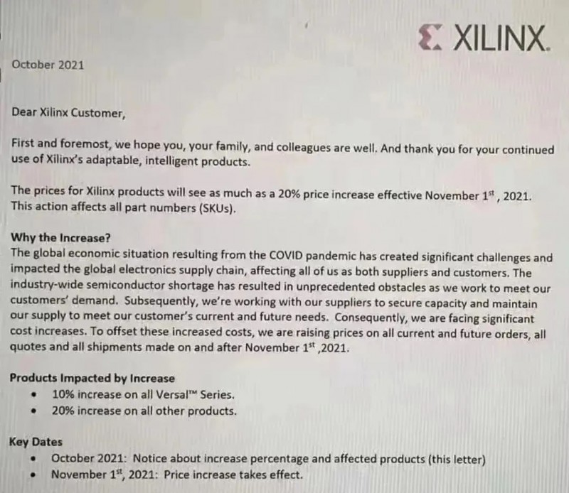 9月底,多家主要海外芯片生產(chǎn)商紛紛宣布,對(duì)IGBT和IC半導(dǎo)體等核心芯片展開(kāi)新一輪漲價(jià)。意法半導(dǎo)體表示,將在今年最后一個(gè)季度提高所有產(chǎn)品價(jià)格,包括現(xiàn)有庫(kù)存;安森美則是從10月初開(kāi)始,對(duì)部分產(chǎn)品漲價(jià)生效,新價(jià)格將適用于新訂單和現(xiàn)有積壓訂單;此外,賽靈思也發(fā)布通知稱(chēng),將會(huì)提高2021年11月1日及之后所有當(dāng)前和未來(lái)的訂單、所有報(bào)價(jià)和所有發(fā)貨的價(jià)格。