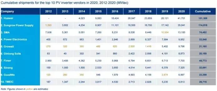(2012-2020年全球前十逆變器供應(yīng)商的出貨數(shù)據(jù)統(tǒng)計(jì)。來(lái)源:伍德麥肯茲)
