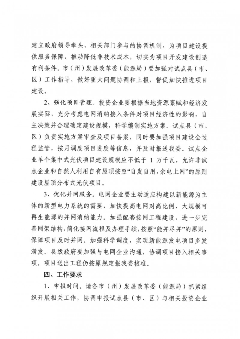 已納入國家試點(diǎn)的12個整縣屋頂分布式光伏試點(diǎn)縣,如縣(市、區(qū))政府和原開發(fā)企業(yè)按要求達(dá)成合作并按時上報相關(guān)材料的,可將試點(diǎn)范圍擴(kuò)大至含地面分布式和集中式在內(nèi)的全部光伏項(xiàng)目,一并納入試點(diǎn)范圍。
