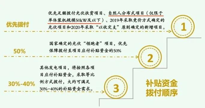 二、電網(wǎng)企業(yè)應(yīng)嚴(yán)格按照《資金管理辦法》,將補(bǔ)貼資金撥付至已納入可再生能源發(fā)電補(bǔ)助項(xiàng)目清單范圍的發(fā)電項(xiàng)目。在撥付補(bǔ)貼資金時,應(yīng)優(yōu)先足額撥付國家光伏扶貧項(xiàng)目、50kW及以下裝機(jī)規(guī)模的自然人分布式項(xiàng)目至2022年底;優(yōu)先足額撥付公共可再生能源獨(dú)立系統(tǒng)項(xiàng)目至2021年底;優(yōu)先足額撥付2019年采取競價方式確定的光伏項(xiàng)目、2020年起采取“以收定支”原則確定的符合撥款條件的新增項(xiàng)目至2021年底;對于國家確定的光伏“領(lǐng)跑者”項(xiàng)目和地方參照中央政策建設(shè)的村級光伏扶貧電站,優(yōu)先保障撥付項(xiàng)目至2021年底應(yīng)付補(bǔ)貼資金的50%;對于其他發(fā)電項(xiàng)目,按照各項(xiàng)目至2021年底應(yīng)付補(bǔ)貼資金,采取等比例方式撥付。