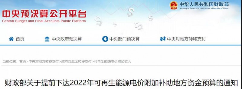 11 月 16日,中央預(yù)算公共平臺發(fā)布“關(guān)于提前下達(dá)2022年可再生能源電價附加補(bǔ)助地方資金預(yù)算的通知”。根據(jù)通知,本次下達(dá)總計(jì)新能源補(bǔ)貼資金38.7億元。其中,風(fēng)電15.5億元、光伏22.8億元、生物質(zhì)3824萬元。