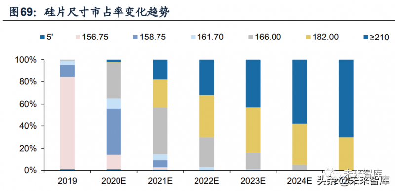 (1)背景:大尺寸化推動(dòng)多環(huán)節(jié)降本,滲透提升成必然趨勢(shì)。在制造端,大尺寸硅片可以提升硅片、電池和組件產(chǎn)出量,從而攤薄單位生產(chǎn)成本;在組件端, 大尺寸硅片能夠有效提升組件功率,通過優(yōu)化電池和組件的設(shè)計(jì)提高組件效率,降低單瓦成本;在系統(tǒng)端,單片組件功率和轉(zhuǎn)換效率的提升可以減少支架及匯流箱等 固定成本。因此,大尺寸化能夠有效攤薄各環(huán)節(jié)加工及BOS成本,推動(dòng)度電成本下降,大尺寸趨勢(shì)確定。據(jù)PV-Infolink預(yù)測,2020年硅片市場仍以158/166mm為 主,市占率為74%,但2021年時(shí)182/210mm尺寸硅片市占率將擴(kuò)大至18%,此后逐年上升。