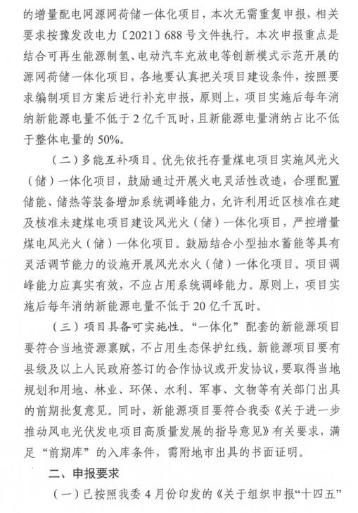 11月30日,河南省發(fā)改委發(fā)布了《關(guān)于補(bǔ)充申報(bào)“十四五”電力源網(wǎng)荷儲(chǔ)一體化和多能互補(bǔ)項(xiàng)目方案》的通知。在今年上半年河南發(fā)改委組織申報(bào)項(xiàng)目的基礎(chǔ)上,再次補(bǔ)充申報(bào)“一體化”項(xiàng)目。