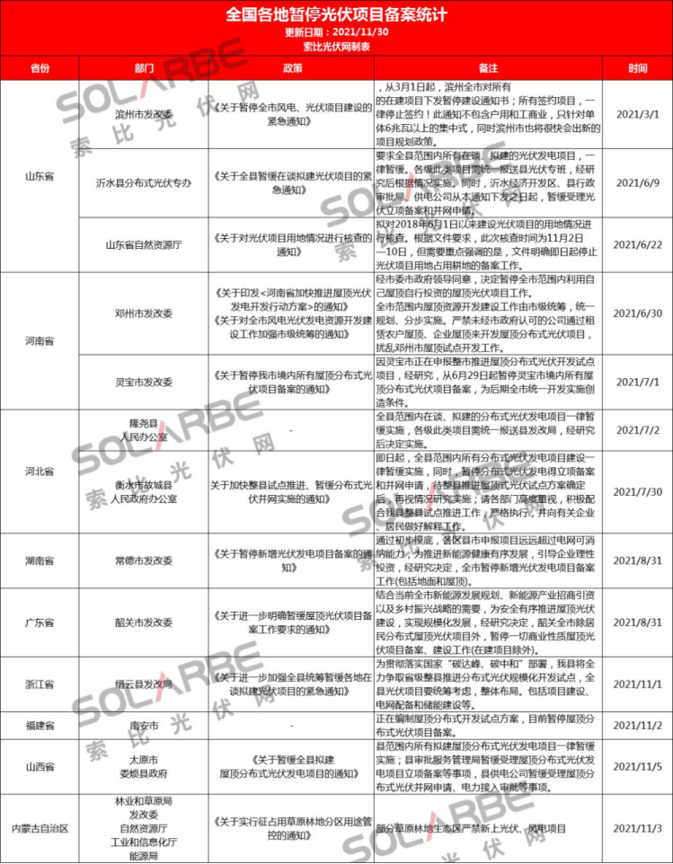 據(jù)索比光伏網(wǎng)統(tǒng)計,截至今年11月末,全國共有13個地區(qū)發(fā)布暫停申報工作的消息,此外,福建省南安市雖未有正式文件,但經(jīng)銷商爆料稱,當(dāng)?shù)匾褵o法進(jìn)行分布式光伏備案并網(wǎng)。