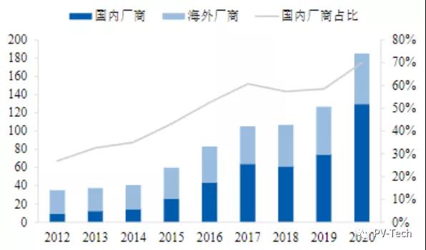 除了頭部企業(yè)外,國(guó)內(nèi)逆變器廠商崛起的另一個(gè)佐證則是近年來出貨占比的不斷提升,根據(jù)Wood Mackenzie的數(shù)據(jù)統(tǒng)計(jì),2012年國(guó)內(nèi)廠商的出貨量在全球的占比不到30%,到2020年這一數(shù)據(jù)已攀升至70%。