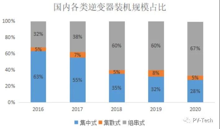 組串式逆變器的市占增長(zhǎng)一方面得益于分布式光伏的不斷發(fā)展,另一方面則是由于組串式逆變器在大型地面電站的應(yīng)用越來越普遍。