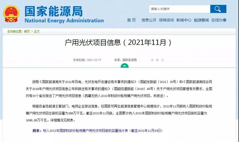 根據(jù)各省級能源主管部門、電網(wǎng)企業(yè)報(bào)送信息,經(jīng)國家可再生能源信息管理中心梳理統(tǒng)計(jì),2021年11月新納入國家財(cái)政補(bǔ)貼規(guī)模戶用光伏項(xiàng)目總裝機(jī)容量為286萬千瓦。截至2021年11月底,全國累計(jì)納入2021年國家財(cái)政補(bǔ)貼規(guī)模戶用光伏項(xiàng)目裝機(jī)容量為1648.86萬千瓦。詳細(xì)情況見附表。