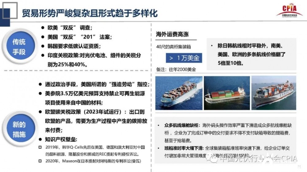 在海外市場中,由于中國六成以上的產(chǎn)品需要出口,而海外市場中貿(mào)易形式嚴峻復雜且形式趨于多樣化。如歐美“雙反”調(diào)查、美國“雙反”“201”法案等。同時海外運費高漲,除日韓航線相對平穩(wěn)外,南美、美國、歐洲的多條航線價格翻了5倍至10倍。
