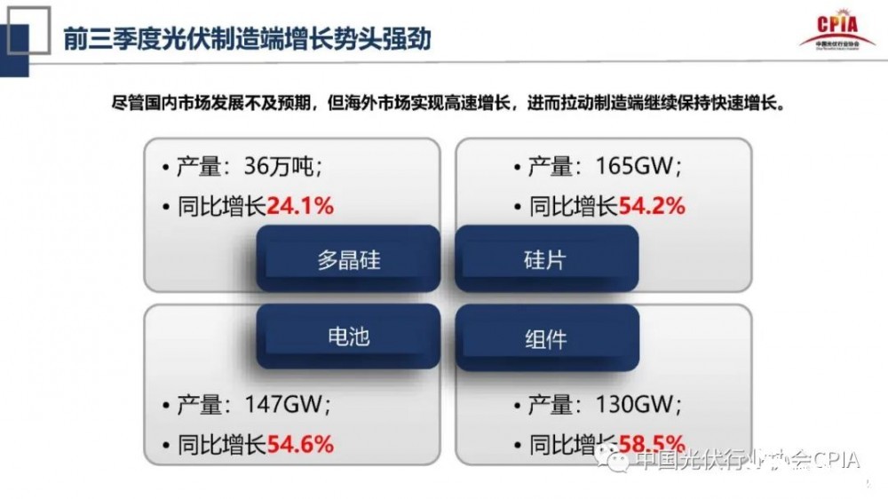 在此次會議上,王勃華對光伏行業(yè)的發(fā)展情況做了詳細介紹。在光伏制造端方面,他指出,2021年前三季度光伏制造端增長勢頭強勁,在光伏制造端四個環(huán)節(jié)中,多晶硅產(chǎn)量為36萬噸,同比增長24.1%;硅片產(chǎn)量為165GW,同比增長54.2%;電池產(chǎn)量為147GW,同比增長54.6%;組件產(chǎn)量為130GW,同比增長58.5%。他表示,盡管國內(nèi)市場發(fā)展不及預期,但海外市場實現(xiàn)了高速增長,進而拉動光伏制造端繼續(xù)保持快速增長。因此,光伏制造端在今年仍處于快速發(fā)展中。