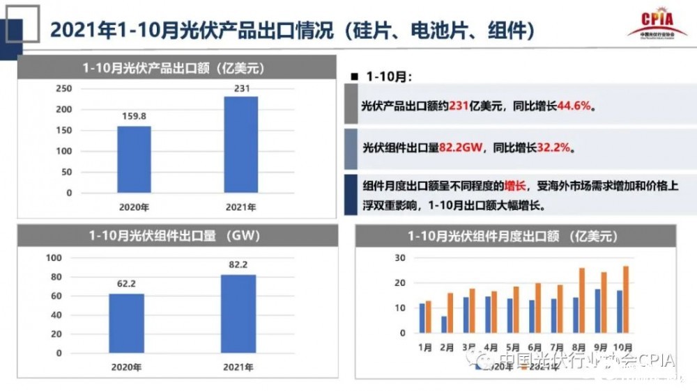 對其增長的原因,王勃華分析稱:“其一是組件月度出口額量不同程度的增長,1-10月光伏組件出口量為82.2GW,同比增長了32.2%,根據(jù)往年數(shù)據(jù)對比,組件每月出口數(shù)據(jù)都有超過去年。其二是受海外市場需求增加和價格上浮雙重影響,1-10月光伏產(chǎn)品出口額呈現(xiàn)大幅增長趨勢。”