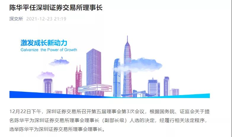 深交所消息,12月22日下午,深圳證券交易所召開(kāi)第五屆理事會(huì)第3次會(huì)議,根據(jù)國(guó)務(wù)院、證監(jiān)會(huì)關(guān)于提名陳華平為深圳證券交易所理事會(huì)理事長(zhǎng)(副部長(zhǎng)級(jí))人選的決定,經(jīng)履行相關(guān)法定程序,選舉陳華平為深圳證券交易所理事會(huì)理事長(zhǎng)。