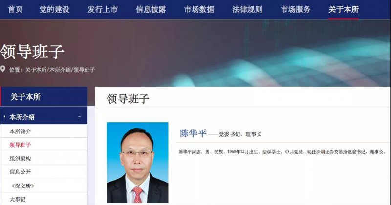 同時(shí),深交所官網(wǎng)上的領(lǐng)導(dǎo)班子介紹信息已更新。官網(wǎng)顯示,陳華平,男,漢族,1968年12月出生,法學(xué)學(xué)士,中共黨員。現(xiàn)任深圳證券交易所黨委書(shū)記、理事長(zhǎng)。