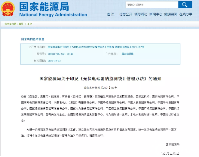 12月20日,國家能源局發(fā)布關(guān)于印發(fā)《光伏電站消納監(jiān)測統(tǒng)計管理辦法》的通知。