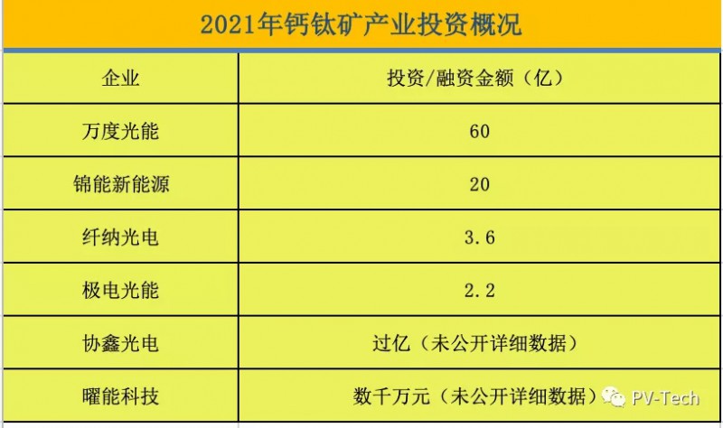 2021年鈣鈦礦產業(yè)投資概況,PV-Tech整理