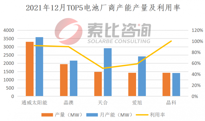 2021年12月,電池企業(yè)產量基本與上月持平,總產量為17.83GW,環(huán)比增加0.22%。按照產量排名,通威、晶澳、天合、愛旭、晶科位列前五,企業(yè)總產量9.57GW,占比53.67%,綜合利用率78.37%。垂直一體化企業(yè)綜合利用率率70.6%,主流電池企業(yè)綜合利用率81.36%。