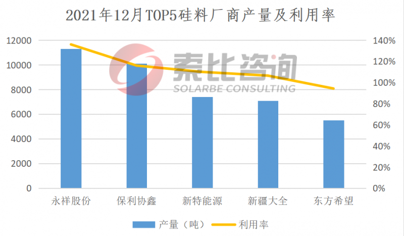 2021年12月,國內12家多晶硅企業(yè)在產,兩家企業(yè)擴產量逐步釋放,產量再創(chuàng)新高。連續(xù)兩周成交清淡,導致部分硅料企業(yè)有少量庫存積壓。12月份國內多晶硅產量為4.88萬噸(約19.28GW),環(huán)比增長15.9%。按照產量排名,永祥、協鑫、新特、大全、東方希望位列前五,企業(yè)總產量4.14萬噸,占比84.8%,綜合利用率112.6%。索比咨詢預期1月份硅料產量小幅上漲。從供應端來看,12月份協鑫顆粒硅及新疆大全擴產產能有少量釋放。從需求端來看,終端采購力度有所回暖,開工率上升。