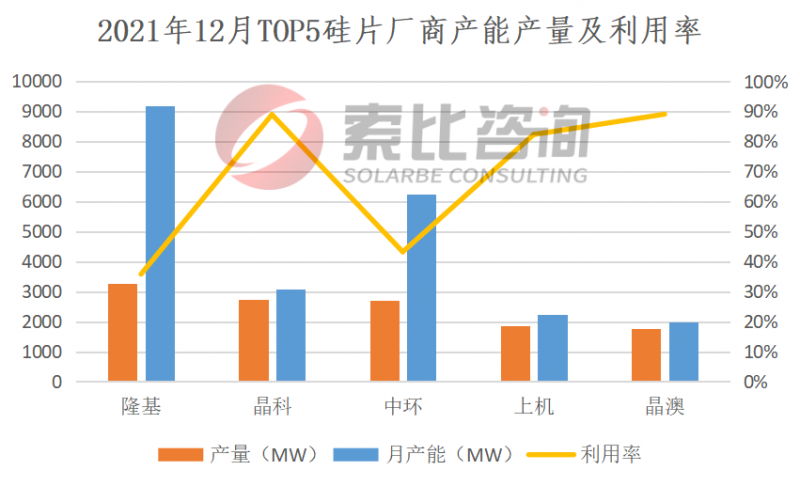 2021年12月,兩家頭部硅片企業(yè)開工率上升至50%和60%,但終端需求不及預期。2021年12月國內硅片產量17.85GW,環(huán)比下降8.6%。按照產量排名,隆基、晶科、中環(huán)、上機、晶澳位列前五,企業(yè)總產量12.35GW,占比69.19%,綜合利用率67.81%。預計12月份硅片產量將有小幅回升。從供應端來看,2022年1月份硅料產量將小幅上漲,硅片也有新產能投產。從需求端來看,終端需求預期將出現小幅提升。