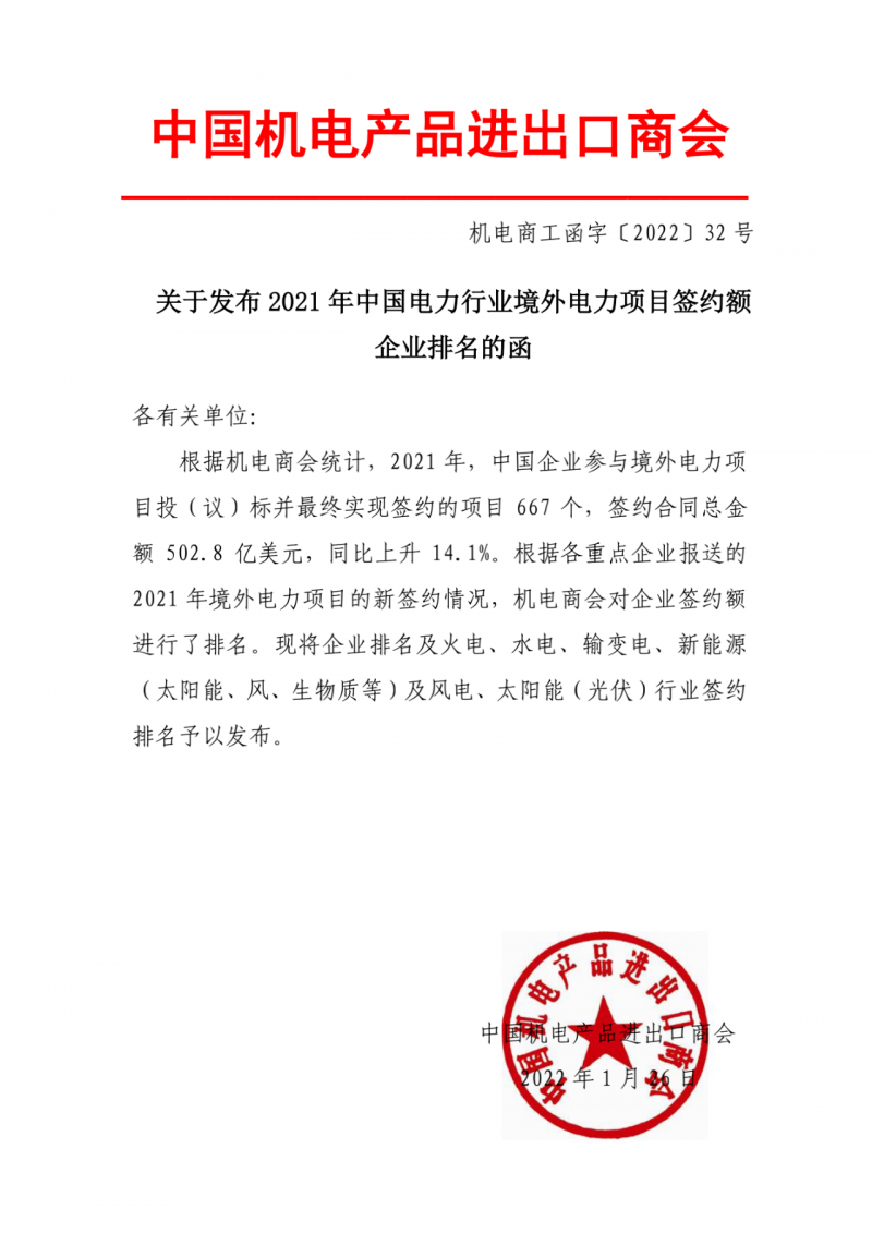 1月26日,中國機電產(chǎn)品進出口商會發(fā)布中國企業(yè)參與境外電力項目投(議)標(biāo)并最終實現(xiàn)簽約的項目667個,簽約合同總金額502.8億美元,同比上升14.1%。并對火電、水電、輸變電、新能源(太陽能、風(fēng)、生物質(zhì)等)及風(fēng)電、太陽能(光伏)行業(yè)簽約額進行了排名。