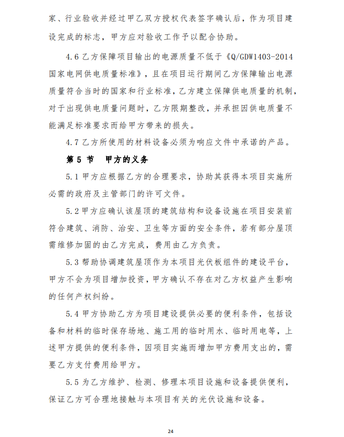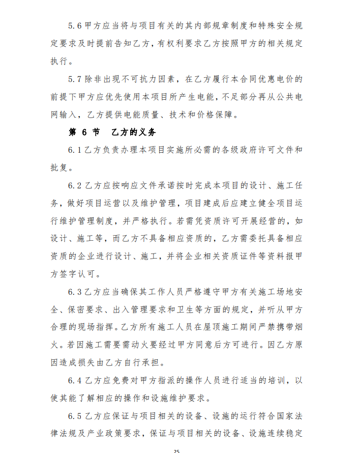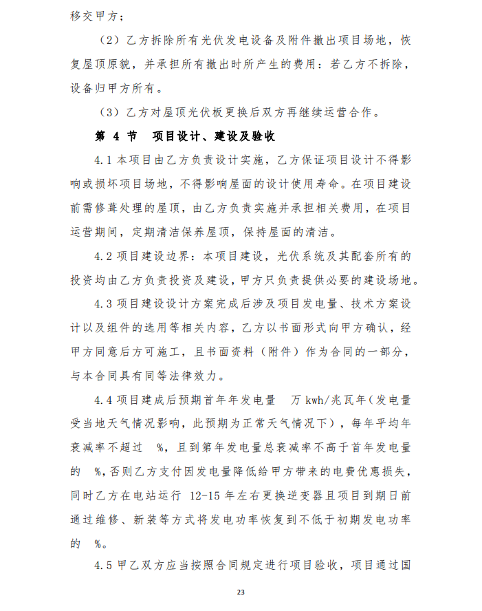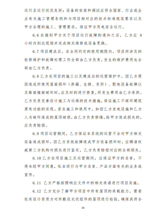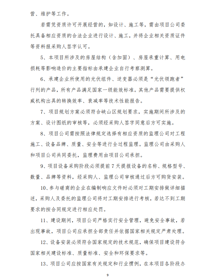 4、由于光伏發(fā)電項目運行生命周期長,安裝用戶點多,面大,為保障安裝戶的權(quán)益,維護社會穩(wěn)定,建設(shè)企業(yè)要提供明確的長期運維方案及保障費用,具體以運維合同為準。