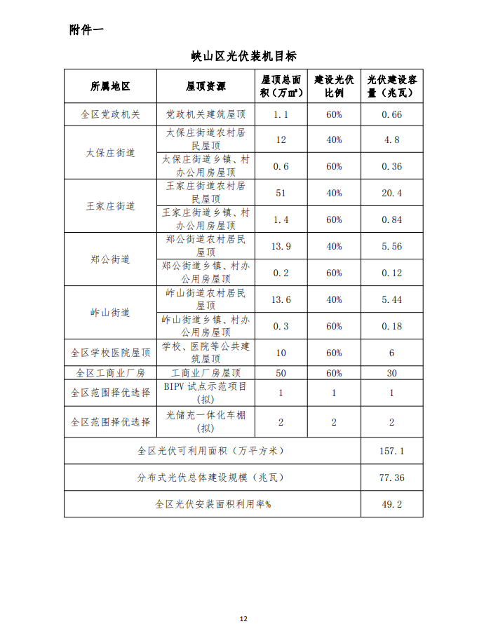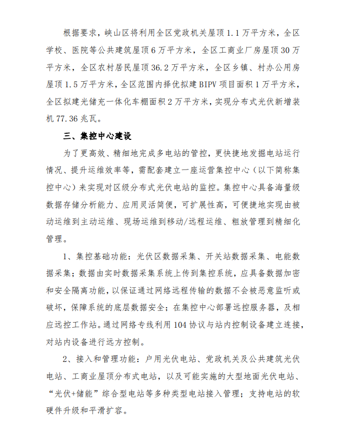 為深入貫徹落實鄉(xiāng)村振興戰(zhàn)略,努力實現(xiàn)國家碳達峰、碳中和戰(zhàn)略任務(wù),統(tǒng)籌推進“源網(wǎng)荷儲-智慧協(xié)同”的分布式光伏建設(shè),打造全國“雙碳”示范區(qū),根據(jù)峽山區(qū)本地光照條件和屋頂資源情況,結(jié)合國家能源局政策要求,峽山區(qū)將利用全區(qū)黨政機關(guān)屋頂 1.1 萬平方米,全區(qū)學校、醫(yī)院等公共建筑屋頂 6 萬平方米,全區(qū)工商業(yè)廠房屋頂 30 萬平方米,全區(qū)農(nóng)村居民屋頂36.2 萬平方米,全區(qū)鄉(xiāng)鎮(zhèn)、村辦公用房屋頂 1.5 萬平方米,全區(qū)范圍內(nèi)擇優(yōu)擬建 BIPV 項目面積 1 萬平方米,全區(qū)擬建光儲充一體化車棚面積 2 萬平方米,實現(xiàn)分布式光伏新增裝機 77.36 兆瓦。