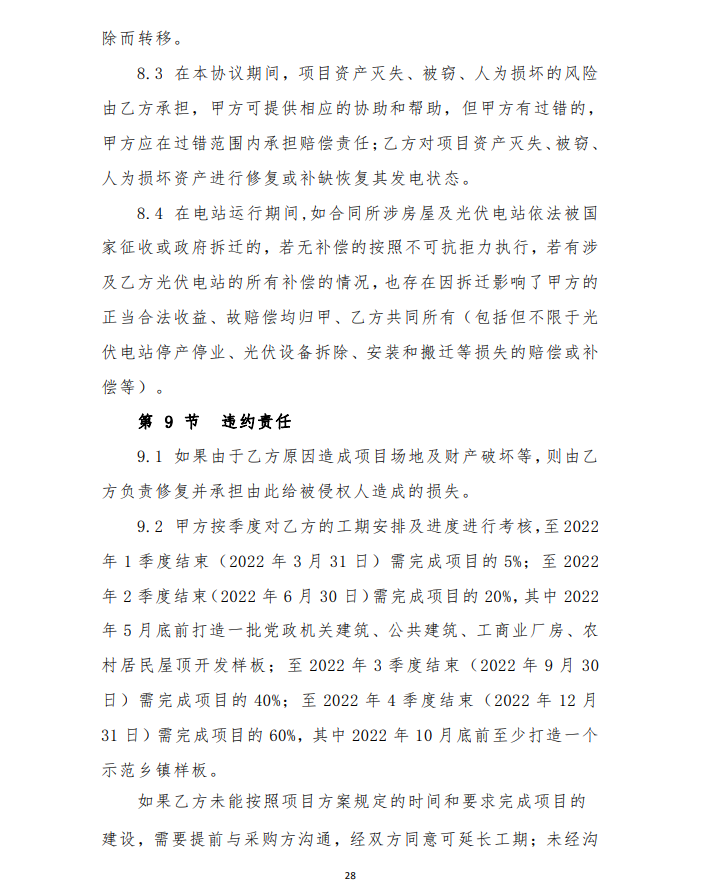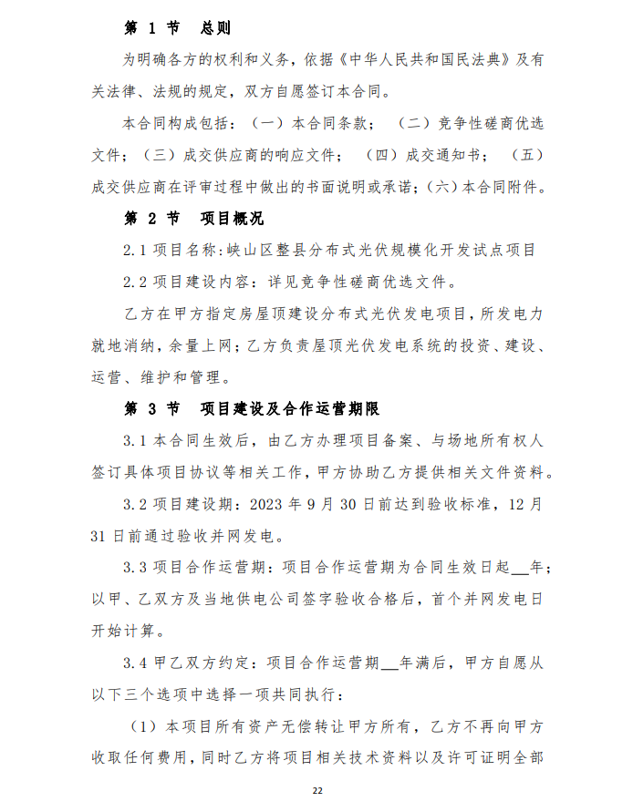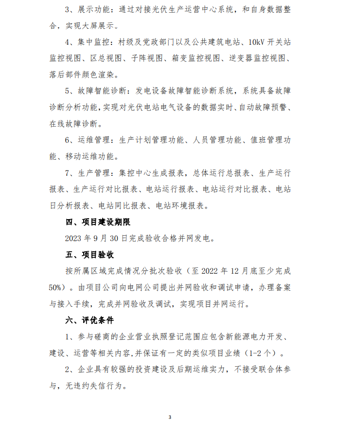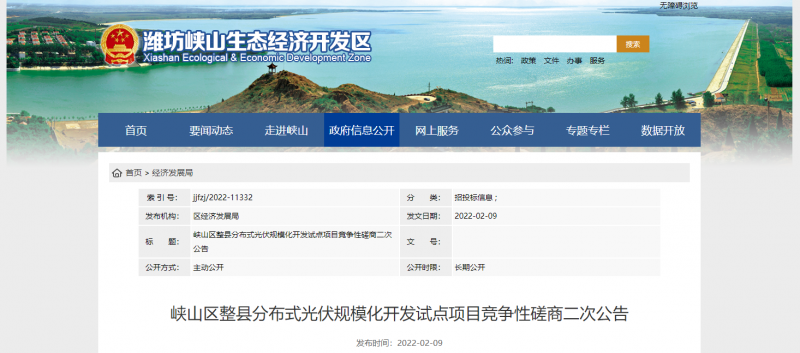 2月9日,山東濰坊峽山區(qū)發(fā)布整縣分布式光伏規(guī)模化開發(fā)試點項目競爭性磋商二次公告,要求2023 年 9 月 30 日完成驗收合格并網(wǎng)發(fā)電,按所屬區(qū)域完成情況分批次驗收(至 2022 年 12 月底至少完成50%)。由項目公司向電網(wǎng)公司提出并網(wǎng)驗收和調(diào)試申請,辦理備案與接入手續(xù),完成并網(wǎng)驗收及調(diào)試,實現(xiàn)項目并網(wǎng)運行。至 2023 年底,光伏項目總投資約 4.0946 億元人民幣。