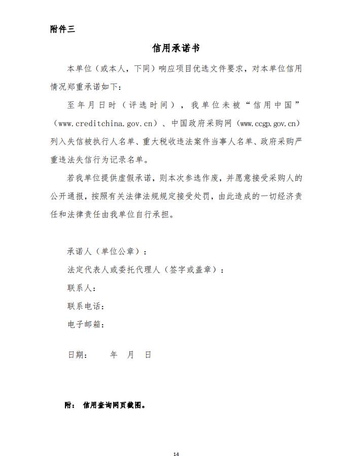 6、參與磋商的企業(yè)未被列入“信用中國”網(wǎng)站(www.creditchina.gov.cn)記錄失信被執(zhí)行人或“重大稅收違法案件當事人名單或企業(yè)經(jīng)營異常名錄”記錄名單;不處于中國政府采購網(wǎng)(www.ccgp.gov.cn)政府采購嚴重違法失信行為信息記錄”中的禁止參加政府采購活動期間;(詳見附件,以上資料查詢時間以本項目磋商優(yōu)選文件發(fā)布至截止時間前為準,如相關(guān)失信記錄已失效,參與企業(yè)需提供相關(guān)證明資料)。