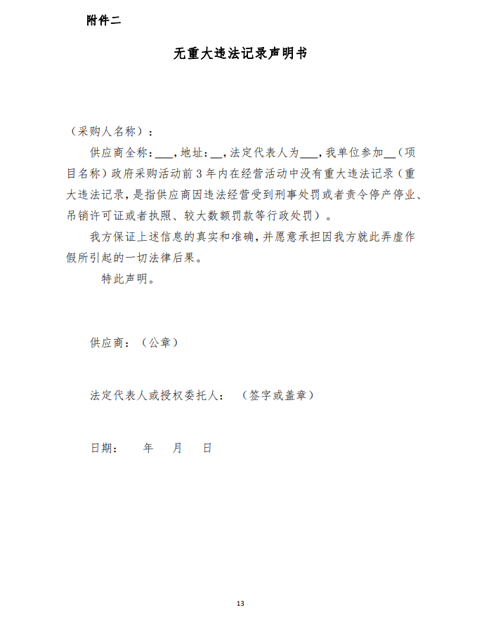 5、參與磋商的企業(yè)在參與政府采購項目3年內(nèi)在經(jīng)營活動中無違法記錄的書面聲明(詳見附件)。