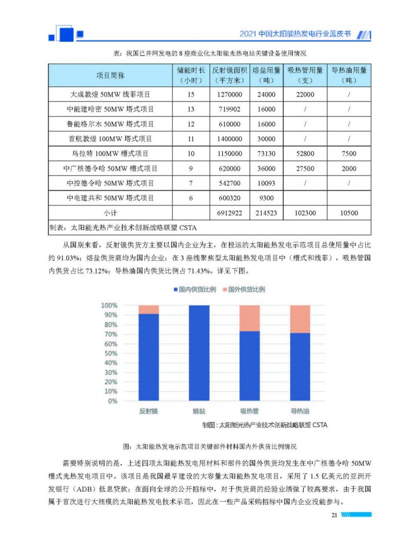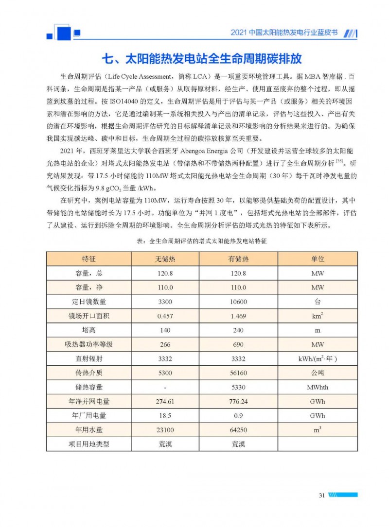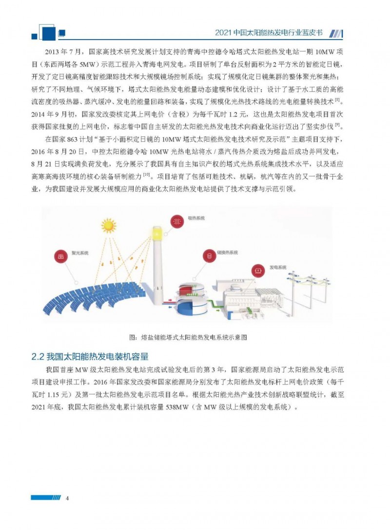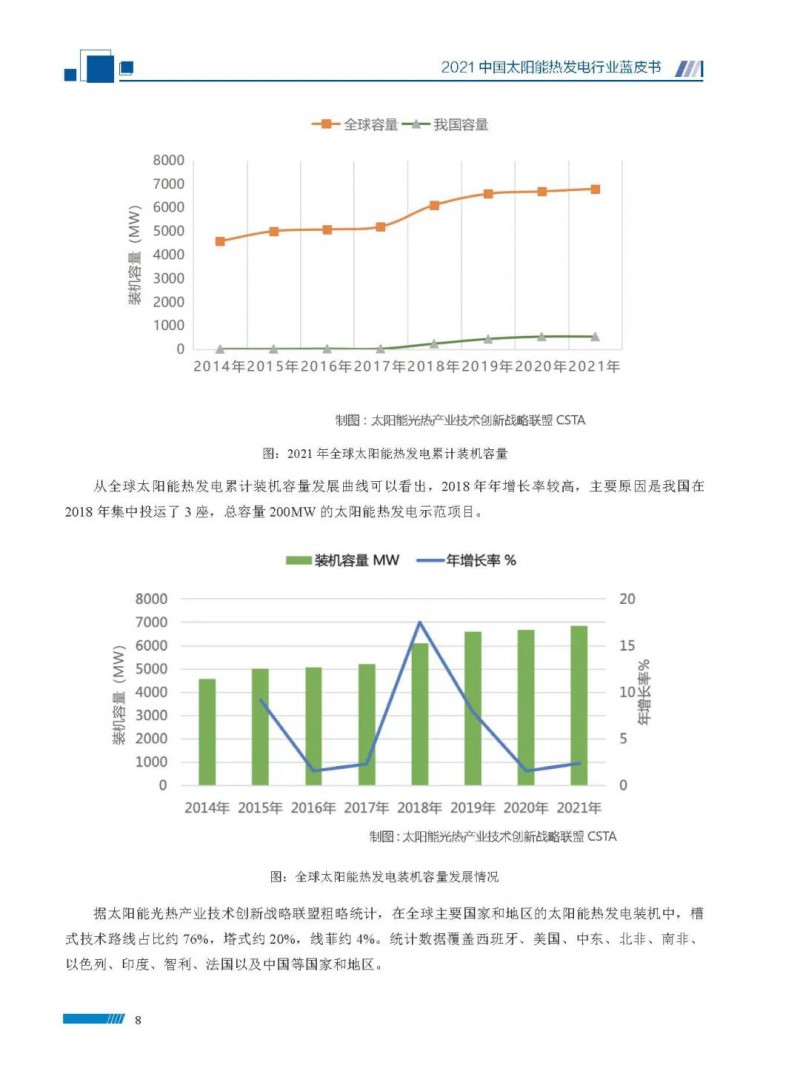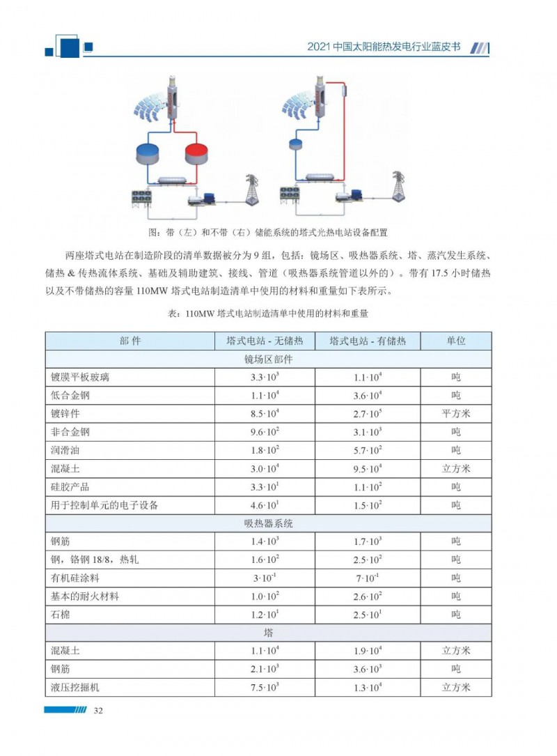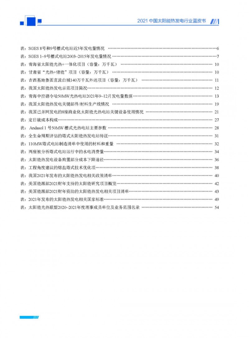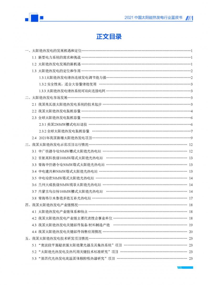 2021中國(guó)太陽(yáng)能熱發(fā)電行業(yè)藍(lán)皮書(shū)(以下簡(jiǎn)稱“藍(lán)皮書(shū)”)共分為9個(gè)章節(jié),分別為:太陽(yáng)能熱發(fā)電的發(fā)展機(jī)遇和定位、太陽(yáng)能熱發(fā)電市場(chǎng)發(fā)展、我國(guó)太陽(yáng)能熱發(fā)電示范項(xiàng)目運(yùn)行情況、我國(guó)太陽(yáng)能熱發(fā)電產(chǎn)業(yè)鏈情況、我國(guó)太陽(yáng)能熱發(fā)電研發(fā)項(xiàng)目情況、太陽(yáng)能熱發(fā)電投資成本、太陽(yáng)能熱發(fā)電站全生命周期碳排放、太陽(yáng)能熱發(fā)電發(fā)展面臨的挑戰(zhàn)及對(duì)策,以及附錄。附錄主要包括:我國(guó)2021年發(fā)布的太陽(yáng)能熱發(fā)電項(xiàng)目政策、美國(guó)能源部2021年度支持的太陽(yáng)能熱發(fā)電項(xiàng)目清單、2021年發(fā)布的太陽(yáng)能熱發(fā)電相關(guān)國(guó)家標(biāo)準(zhǔn)、我國(guó)太陽(yáng)能熱發(fā)電行業(yè)發(fā)展主要?dú)v程、太陽(yáng)能光熱聯(lián)盟理事成員單位及業(yè)務(wù)范圍名錄。全文4.5萬(wàn)+字,共55張圖表。
