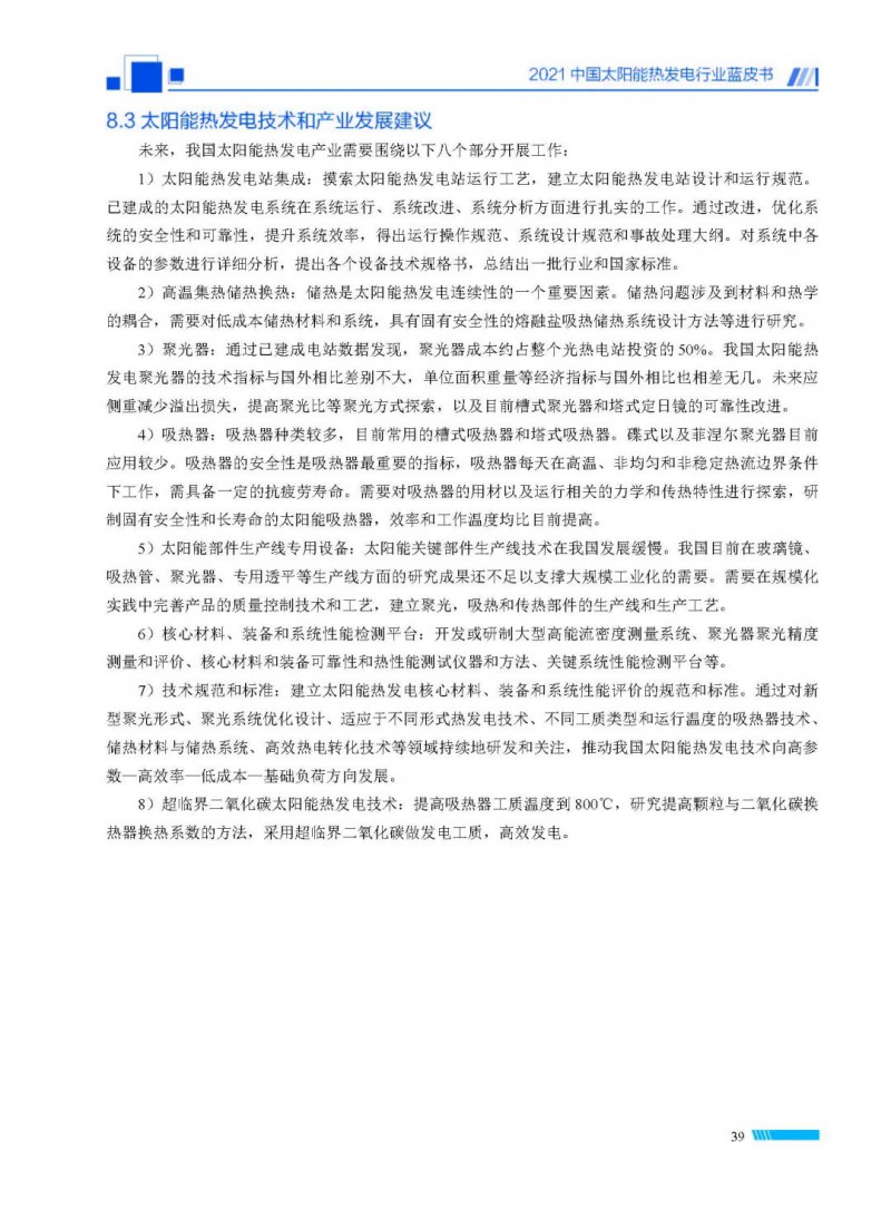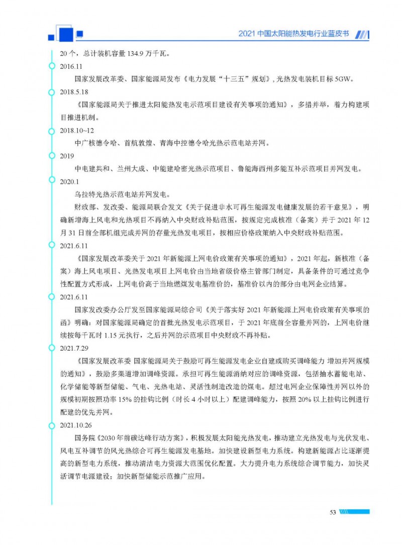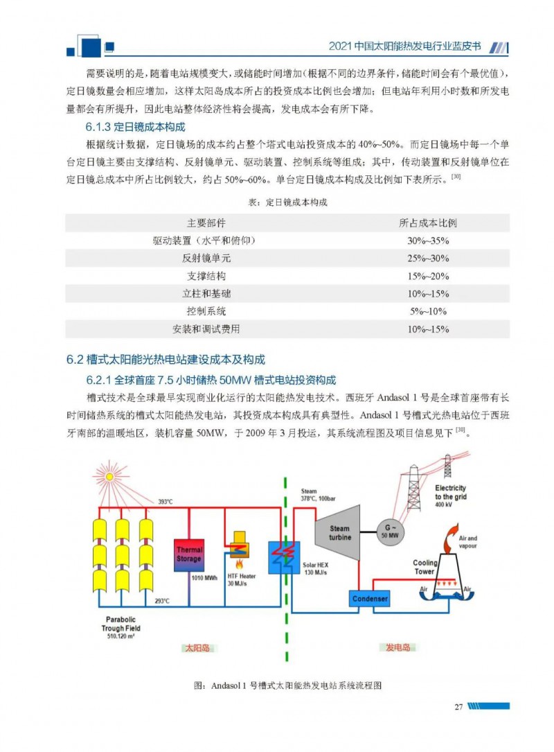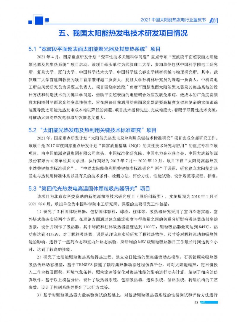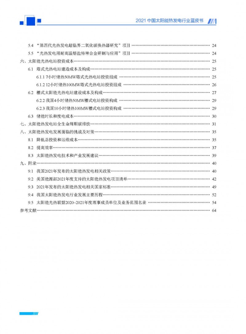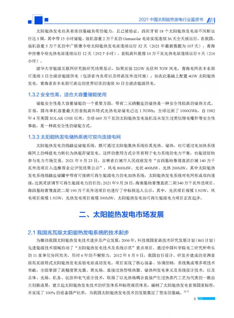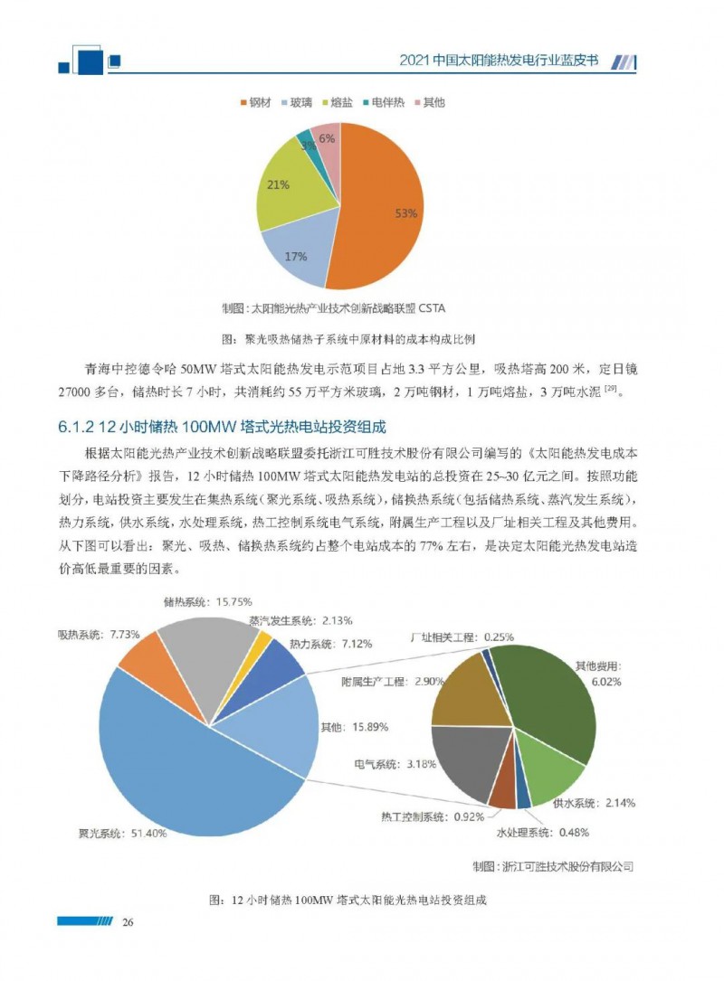 2021中國(guó)太陽(yáng)能熱發(fā)電行業(yè)藍(lán)皮書(shū)(以下簡(jiǎn)稱“藍(lán)皮書(shū)”)共分為9個(gè)章節(jié),分別為:太陽(yáng)能熱發(fā)電的發(fā)展機(jī)遇和定位、太陽(yáng)能熱發(fā)電市場(chǎng)發(fā)展、我國(guó)太陽(yáng)能熱發(fā)電示范項(xiàng)目運(yùn)行情況、我國(guó)太陽(yáng)能熱發(fā)電產(chǎn)業(yè)鏈情況、我國(guó)太陽(yáng)能熱發(fā)電研發(fā)項(xiàng)目情況、太陽(yáng)能熱發(fā)電投資成本、太陽(yáng)能熱發(fā)電站全生命周期碳排放、太陽(yáng)能熱發(fā)電發(fā)展面臨的挑戰(zhàn)及對(duì)策,以及附錄。附錄主要包括:我國(guó)2021年發(fā)布的太陽(yáng)能熱發(fā)電項(xiàng)目政策、美國(guó)能源部2021年度支持的太陽(yáng)能熱發(fā)電項(xiàng)目清單、2021年發(fā)布的太陽(yáng)能熱發(fā)電相關(guān)國(guó)家標(biāo)準(zhǔn)、我國(guó)太陽(yáng)能熱發(fā)電行業(yè)發(fā)展主要?dú)v程、太陽(yáng)能光熱聯(lián)盟理事成員單位及業(yè)務(wù)范圍名錄。全文4.5萬(wàn)+字,共55張圖表。