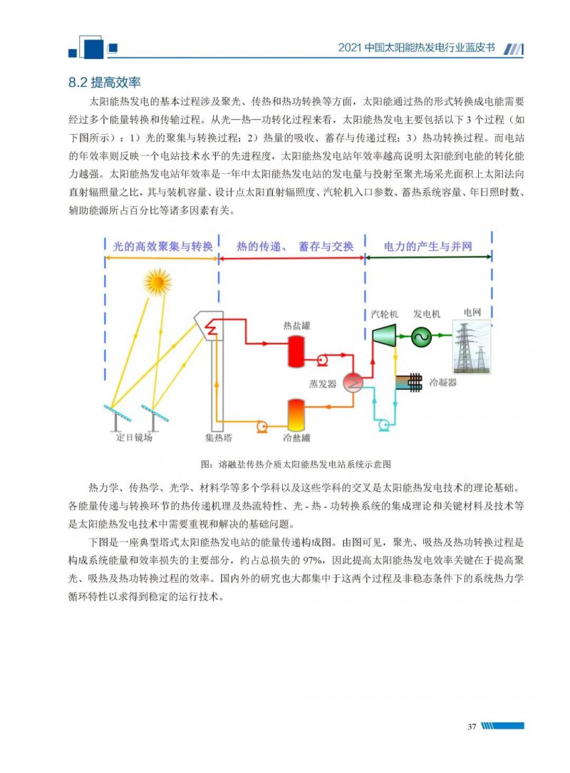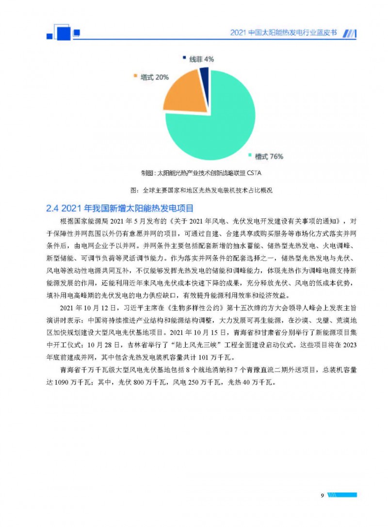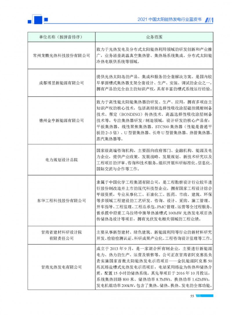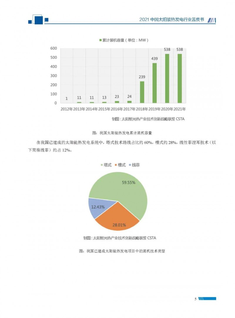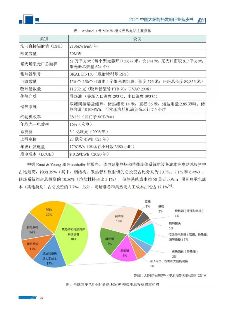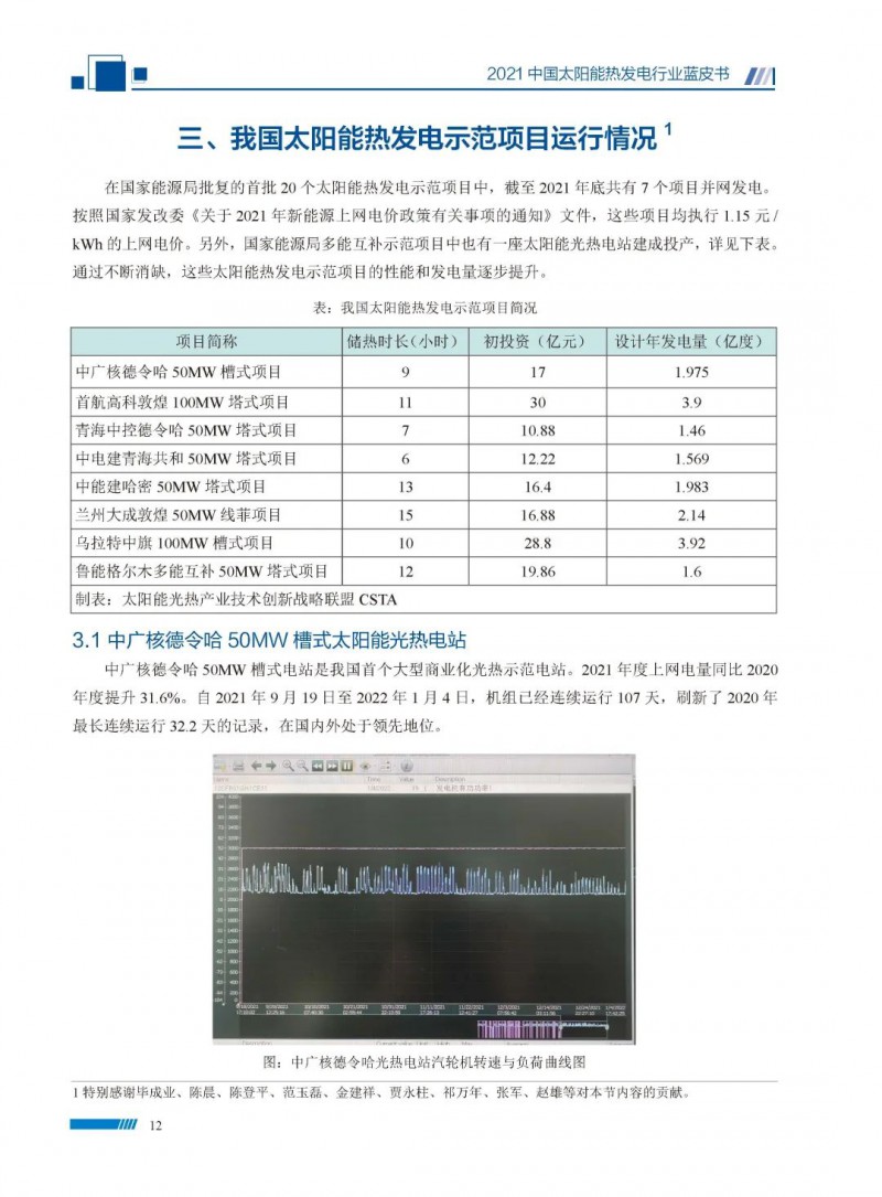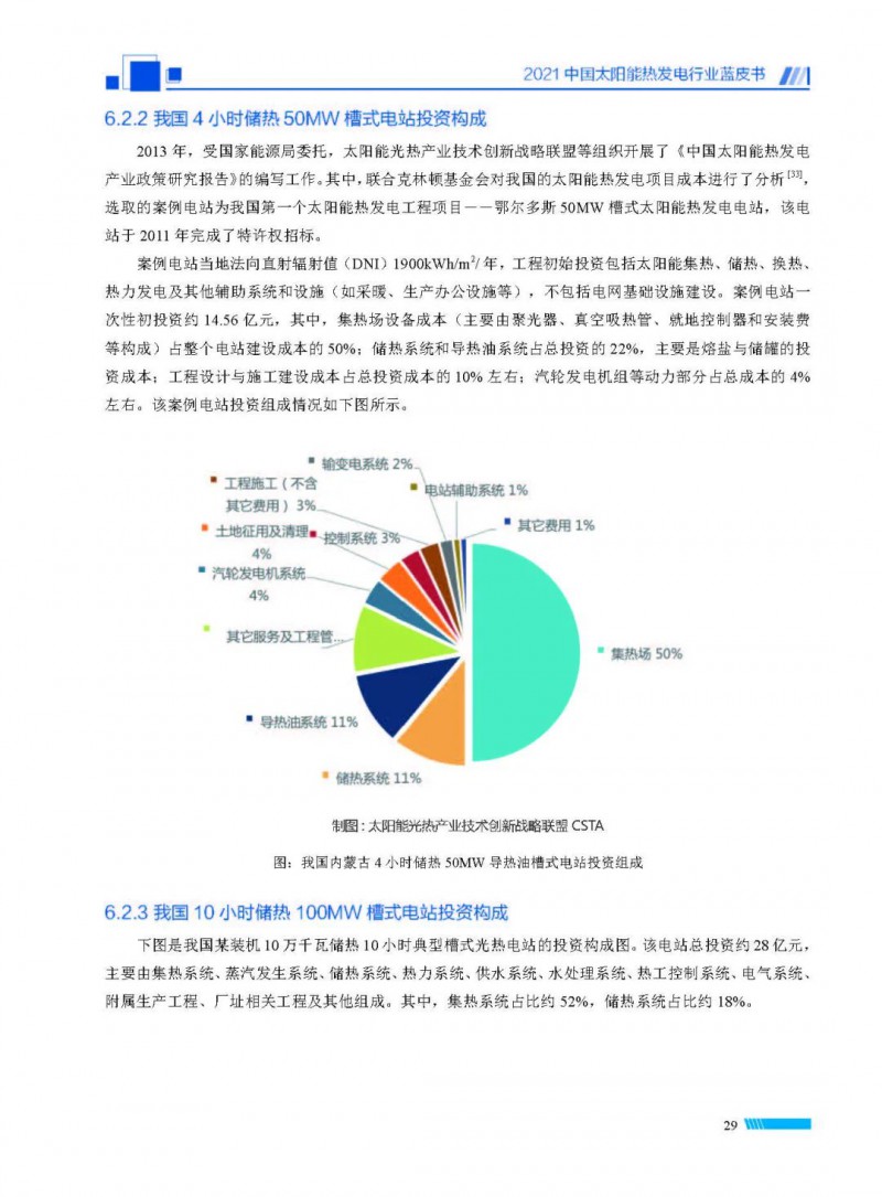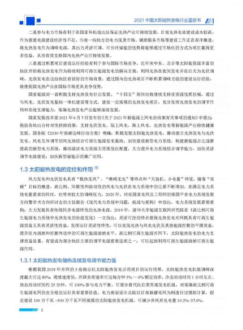 2021中國(guó)太陽(yáng)能熱發(fā)電行業(yè)藍(lán)皮書(shū)(以下簡(jiǎn)稱“藍(lán)皮書(shū)”)共分為9個(gè)章節(jié),分別為:太陽(yáng)能熱發(fā)電的發(fā)展機(jī)遇和定位、太陽(yáng)能熱發(fā)電市場(chǎng)發(fā)展、我國(guó)太陽(yáng)能熱發(fā)電示范項(xiàng)目運(yùn)行情況、我國(guó)太陽(yáng)能熱發(fā)電產(chǎn)業(yè)鏈情況、我國(guó)太陽(yáng)能熱發(fā)電研發(fā)項(xiàng)目情況、太陽(yáng)能熱發(fā)電投資成本、太陽(yáng)能熱發(fā)電站全生命周期碳排放、太陽(yáng)能熱發(fā)電發(fā)展面臨的挑戰(zhàn)及對(duì)策,以及附錄。附錄主要包括:我國(guó)2021年發(fā)布的太陽(yáng)能熱發(fā)電項(xiàng)目政策、美國(guó)能源部2021年度支持的太陽(yáng)能熱發(fā)電項(xiàng)目清單、2021年發(fā)布的太陽(yáng)能熱發(fā)電相關(guān)國(guó)家標(biāo)準(zhǔn)、我國(guó)太陽(yáng)能熱發(fā)電行業(yè)發(fā)展主要?dú)v程、太陽(yáng)能光熱聯(lián)盟理事成員單位及業(yè)務(wù)范圍名錄。全文4.5萬(wàn)+字,共55張圖表。