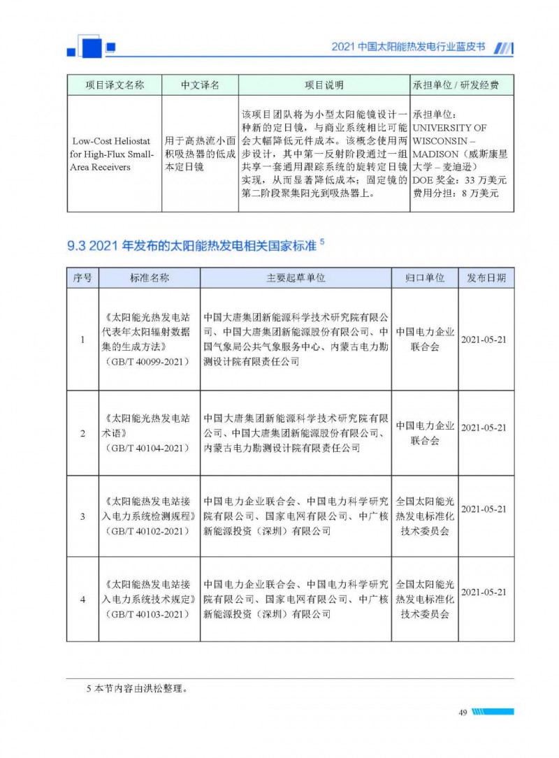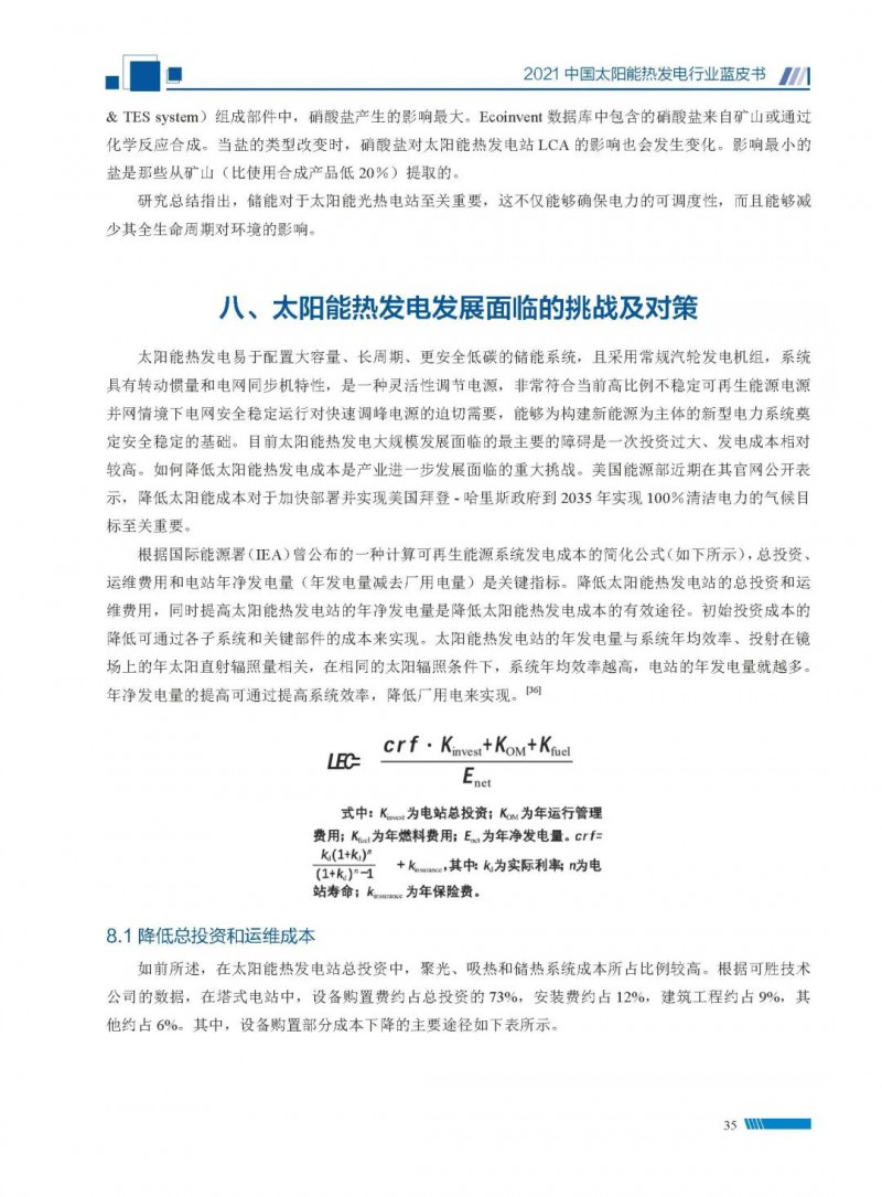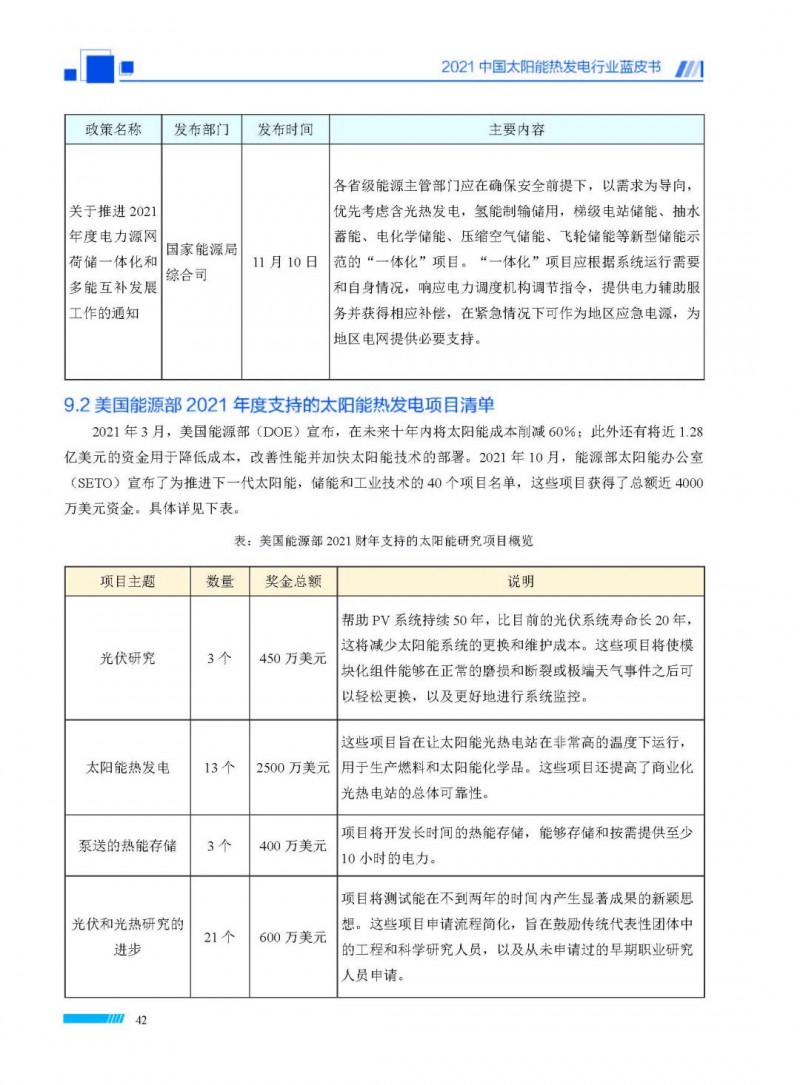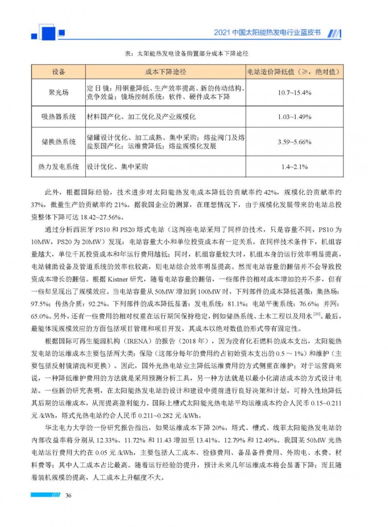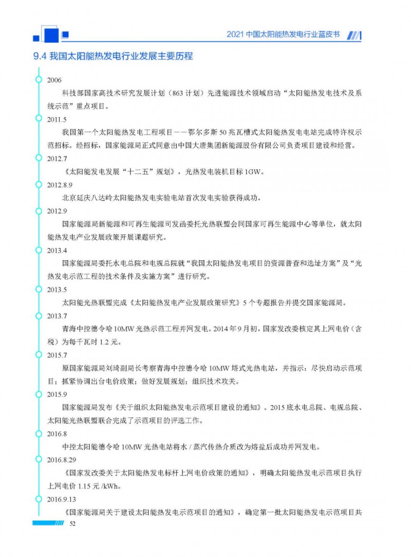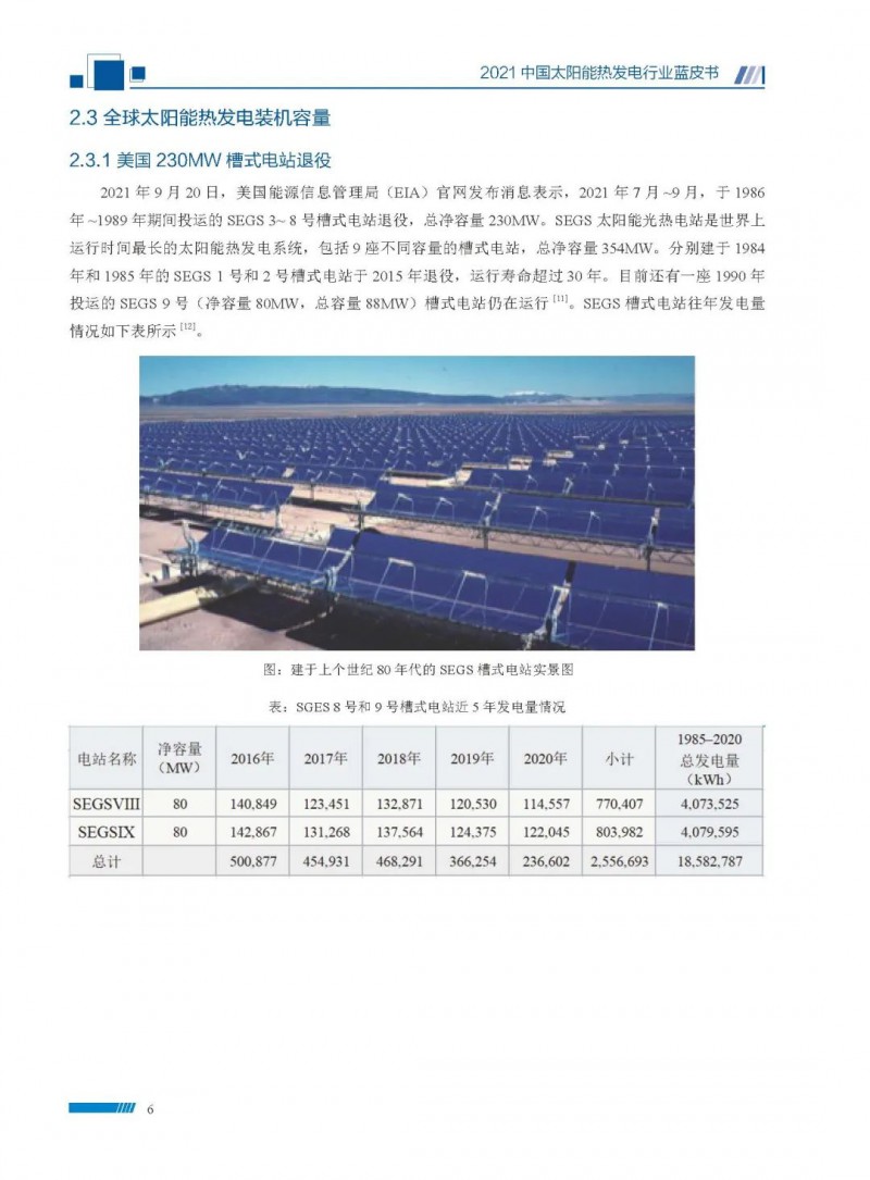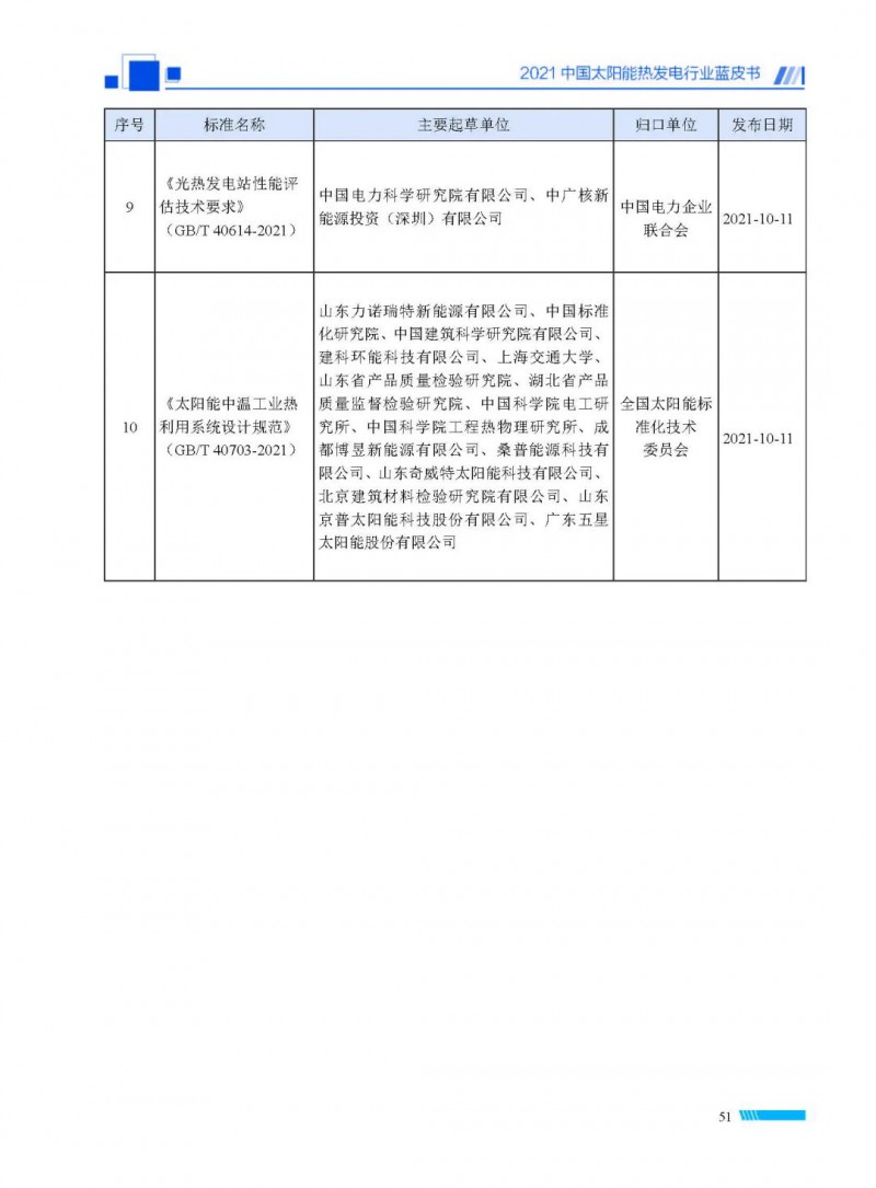2021中國(guó)太陽(yáng)能熱發(fā)電行業(yè)藍(lán)皮書(shū)(以下簡(jiǎn)稱“藍(lán)皮書(shū)”)共分為9個(gè)章節(jié),分別為:太陽(yáng)能熱發(fā)電的發(fā)展機(jī)遇和定位、太陽(yáng)能熱發(fā)電市場(chǎng)發(fā)展、我國(guó)太陽(yáng)能熱發(fā)電示范項(xiàng)目運(yùn)行情況、我國(guó)太陽(yáng)能熱發(fā)電產(chǎn)業(yè)鏈情況、我國(guó)太陽(yáng)能熱發(fā)電研發(fā)項(xiàng)目情況、太陽(yáng)能熱發(fā)電投資成本、太陽(yáng)能熱發(fā)電站全生命周期碳排放、太陽(yáng)能熱發(fā)電發(fā)展面臨的挑戰(zhàn)及對(duì)策,以及附錄。附錄主要包括:我國(guó)2021年發(fā)布的太陽(yáng)能熱發(fā)電項(xiàng)目政策、美國(guó)能源部2021年度支持的太陽(yáng)能熱發(fā)電項(xiàng)目清單、2021年發(fā)布的太陽(yáng)能熱發(fā)電相關(guān)國(guó)家標(biāo)準(zhǔn)、我國(guó)太陽(yáng)能熱發(fā)電行業(yè)發(fā)展主要?dú)v程、太陽(yáng)能光熱聯(lián)盟理事成員單位及業(yè)務(wù)范圍名錄。全文4.5萬(wàn)+字,共55張圖表。